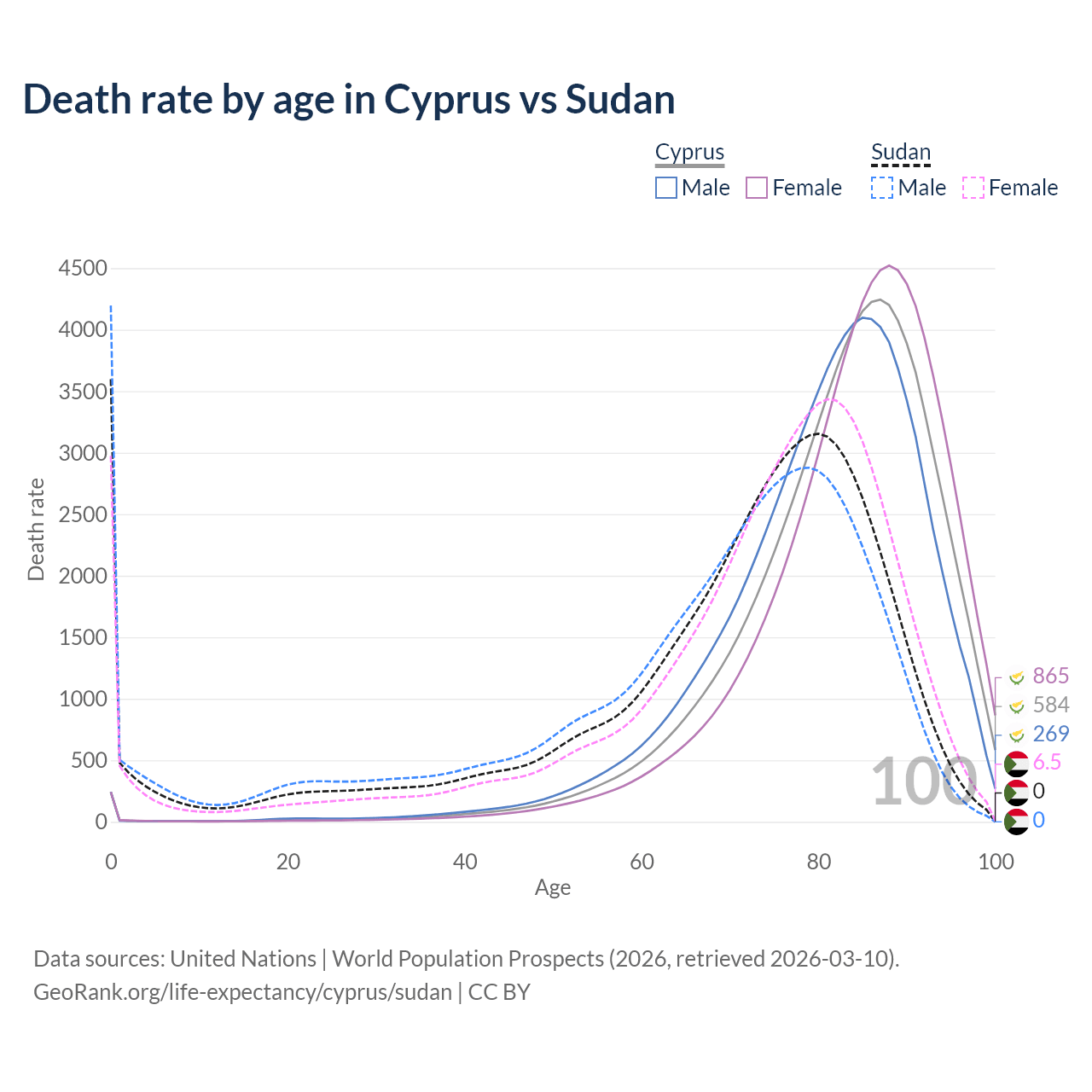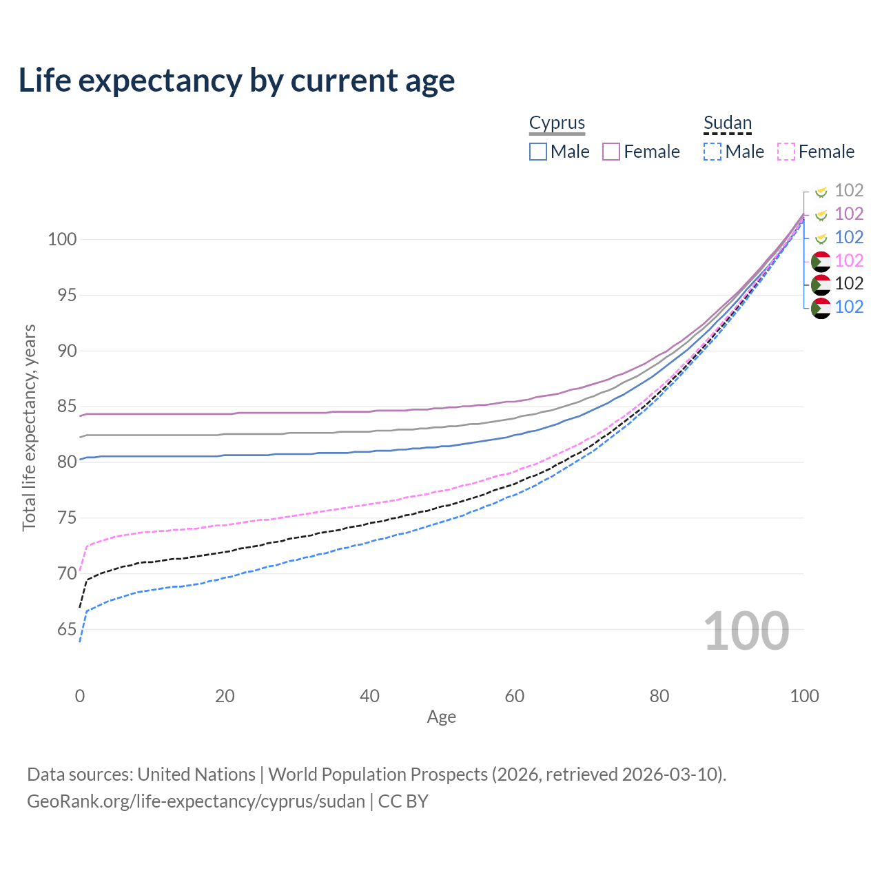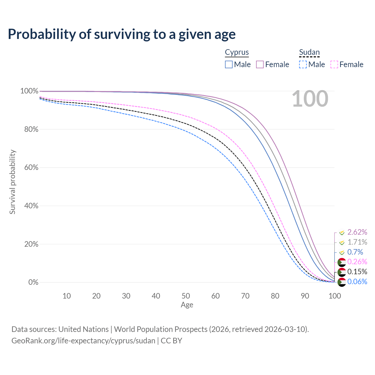 This life expectancy calculator shows the odds of living to 100, 95, 90, and below based on current age for both males and females in Cyprus and Sudan, along with mean and median age of death. The calculations are based on the 2026 life tables (actuarial tables) from the UN World Population Prospects.