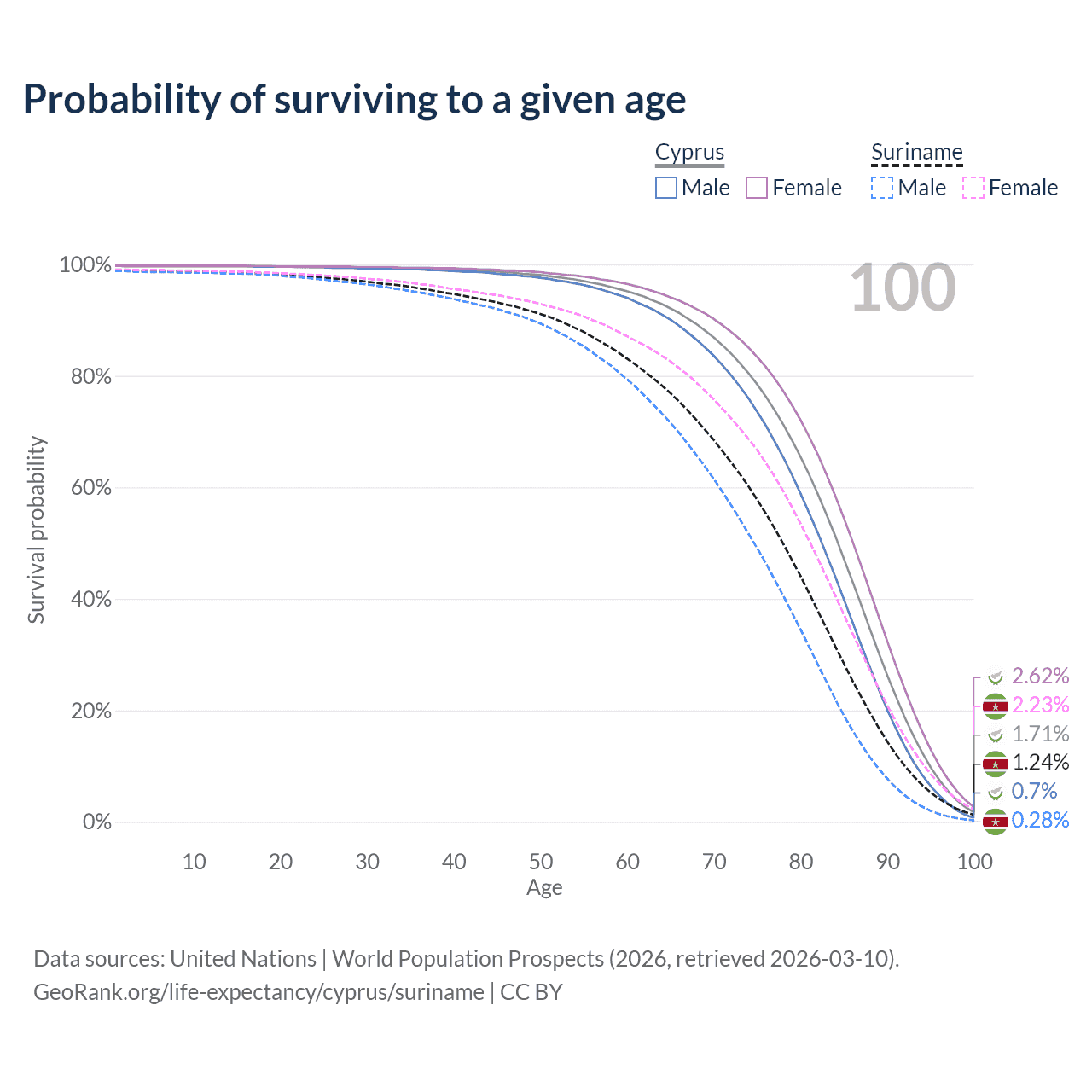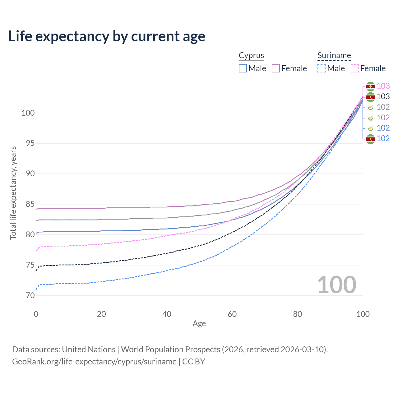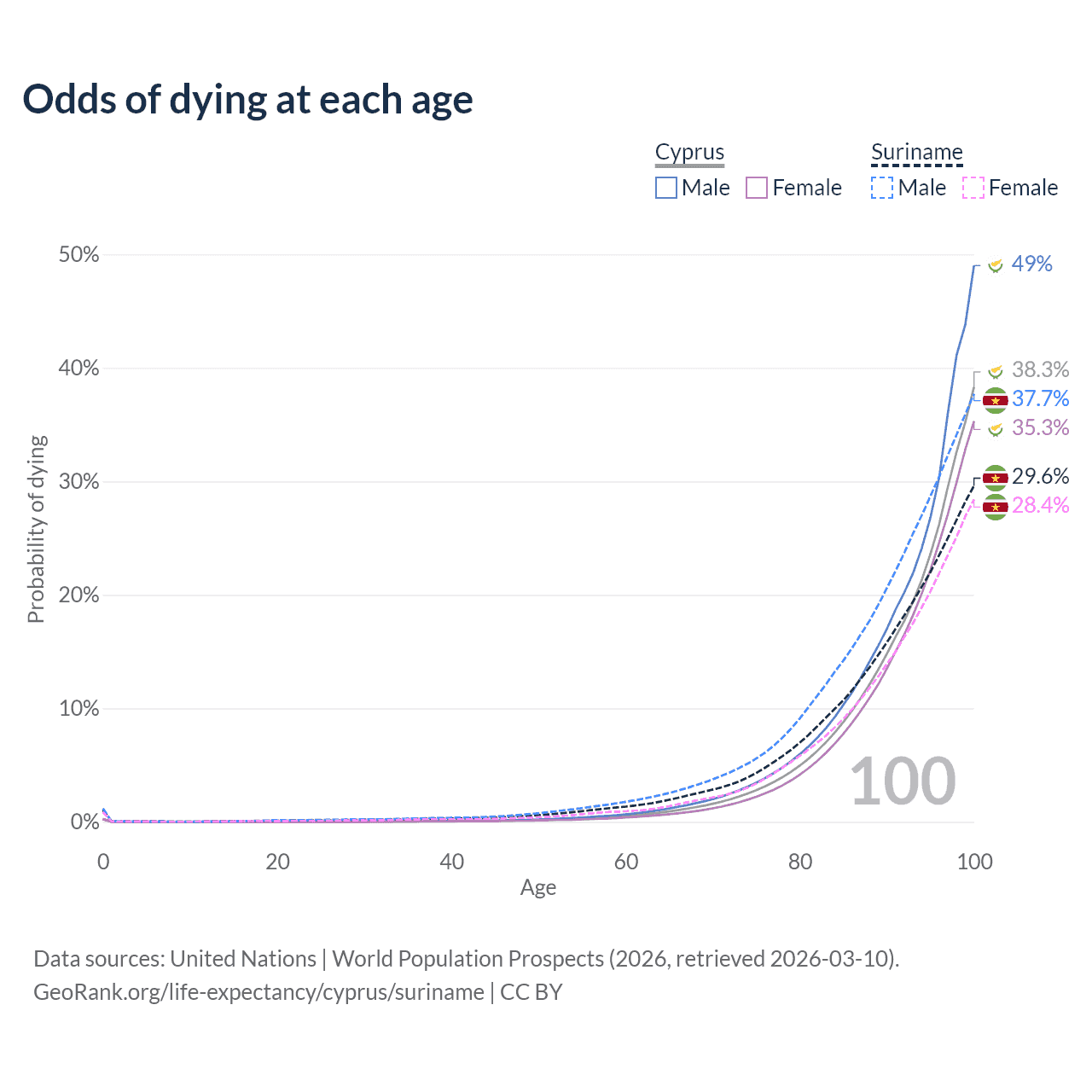This life expectancy calculator shows the odds of living to 100, 95, 90, and below based on current age for both males and females in Cyprus and Suriname, along with mean and median age of death. The calculations are based on the 2026 life tables (actuarial tables) from the UN World Population Prospects.