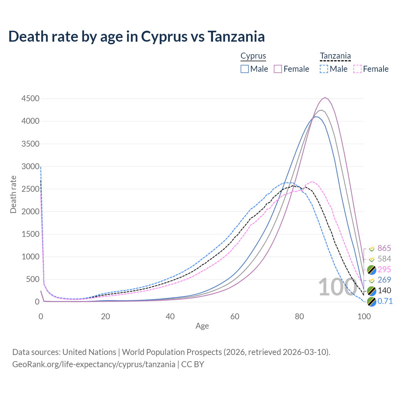 In Cyprus, the most common age of death is 87, compared to 0 in Tanzania. The median age of death is 84.3 in Cyprus and 72.6 in Tanzania, meaning only half of each cohort is expected to live past that age.