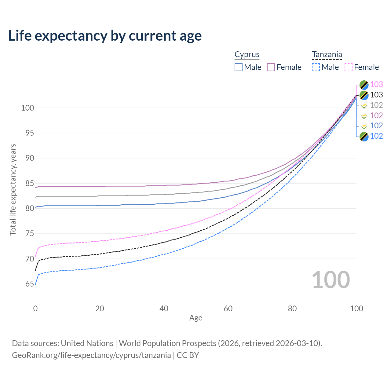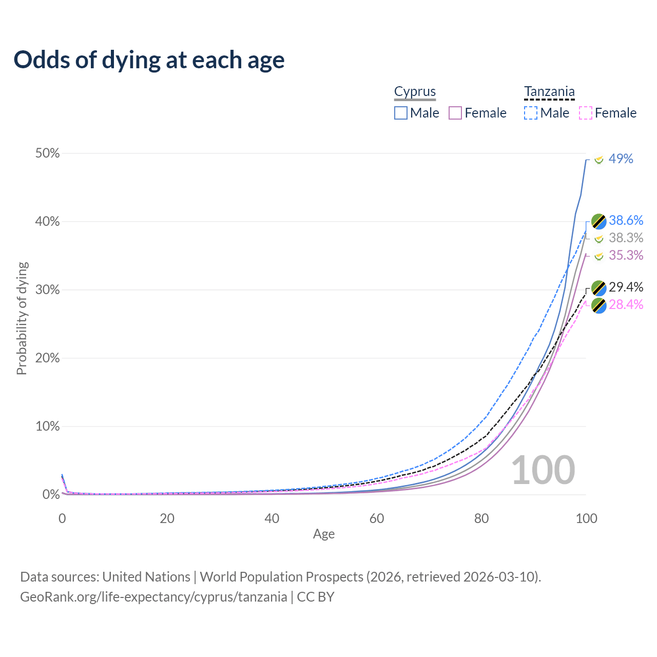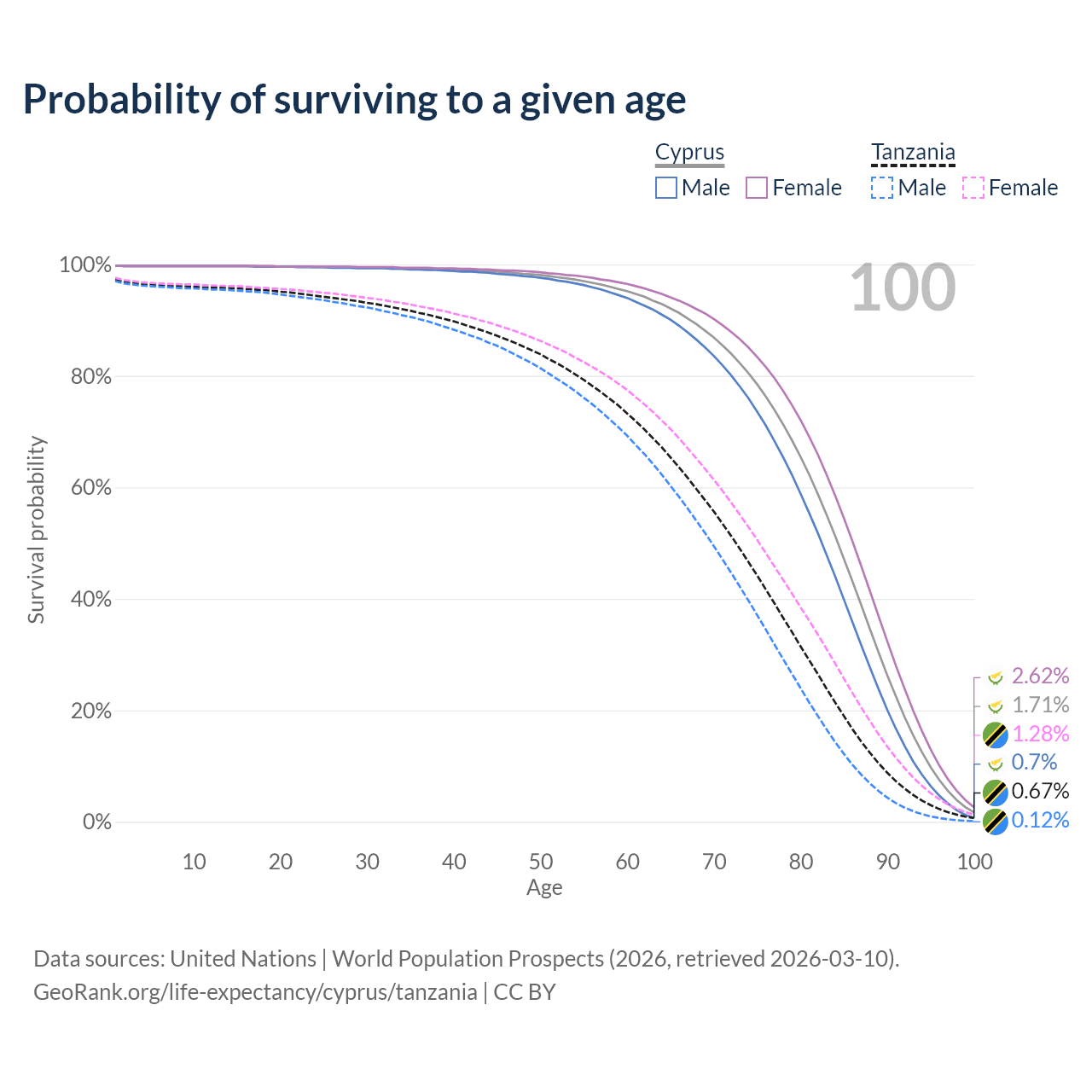 This life expectancy calculator shows the odds of living to 100, 95, 90, and below based on current age for both males and females in Cyprus and Tanzania, along with mean and median age of death. The calculations are based on the 2026 life tables (actuarial tables) from the UN World Population Prospects.