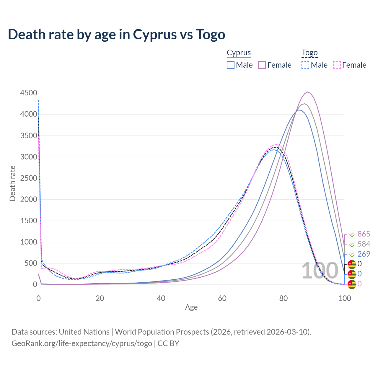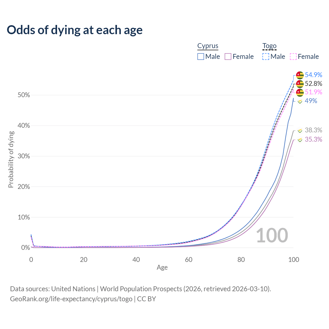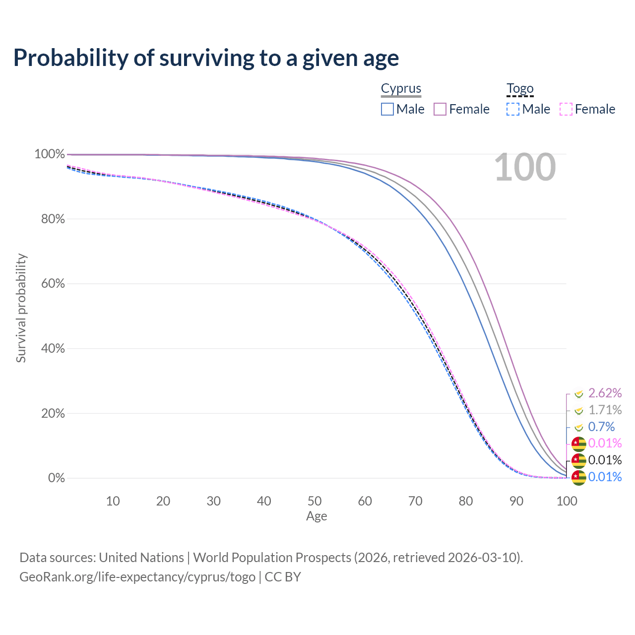 This life expectancy calculator shows the odds of living to 100, 95, 90, and below based on current age for both males and females in Cyprus and Togo, along with mean and median age of death. The calculations are based on the 2026 life tables (actuarial tables) from the UN World Population Prospects.