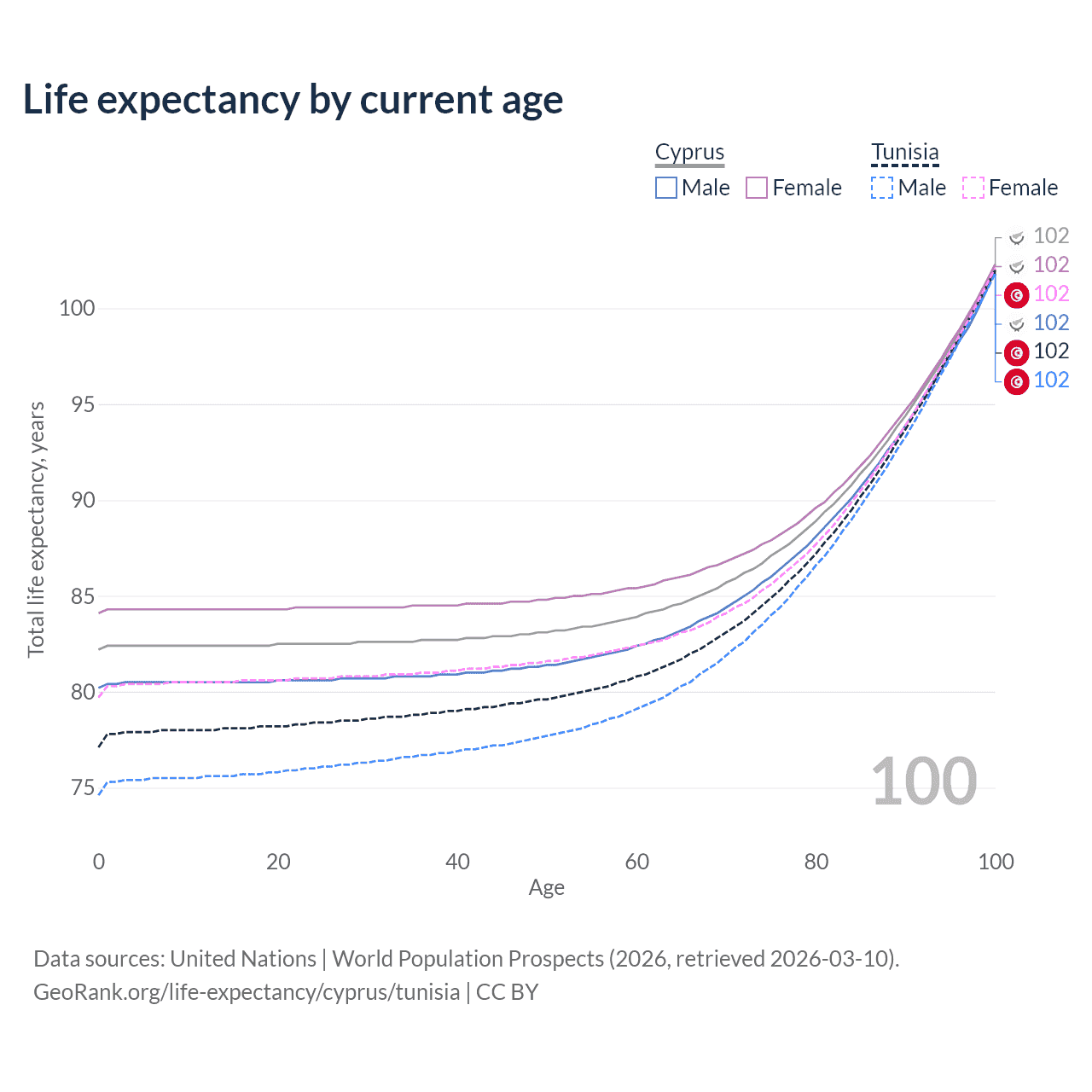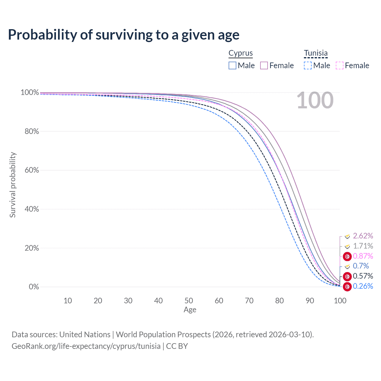 This life expectancy calculator shows the odds of living to 100, 95, 90, and below based on current age for both males and females in Cyprus and Tunisia, along with mean and median age of death. The calculations are based on the 2026 life tables (actuarial tables) from the UN World Population Prospects.