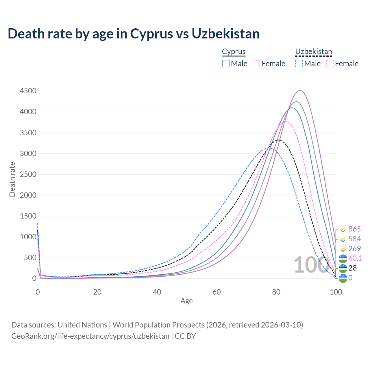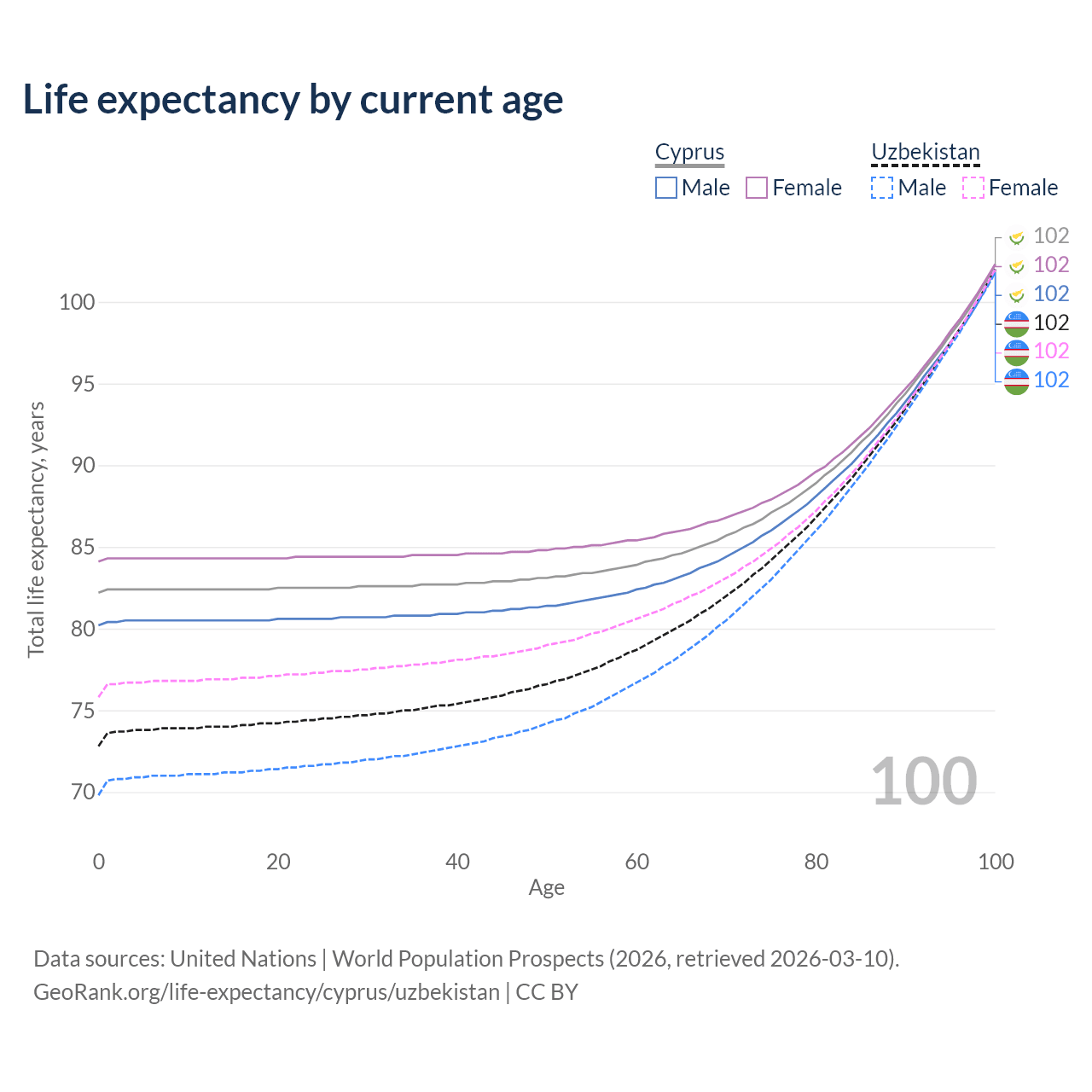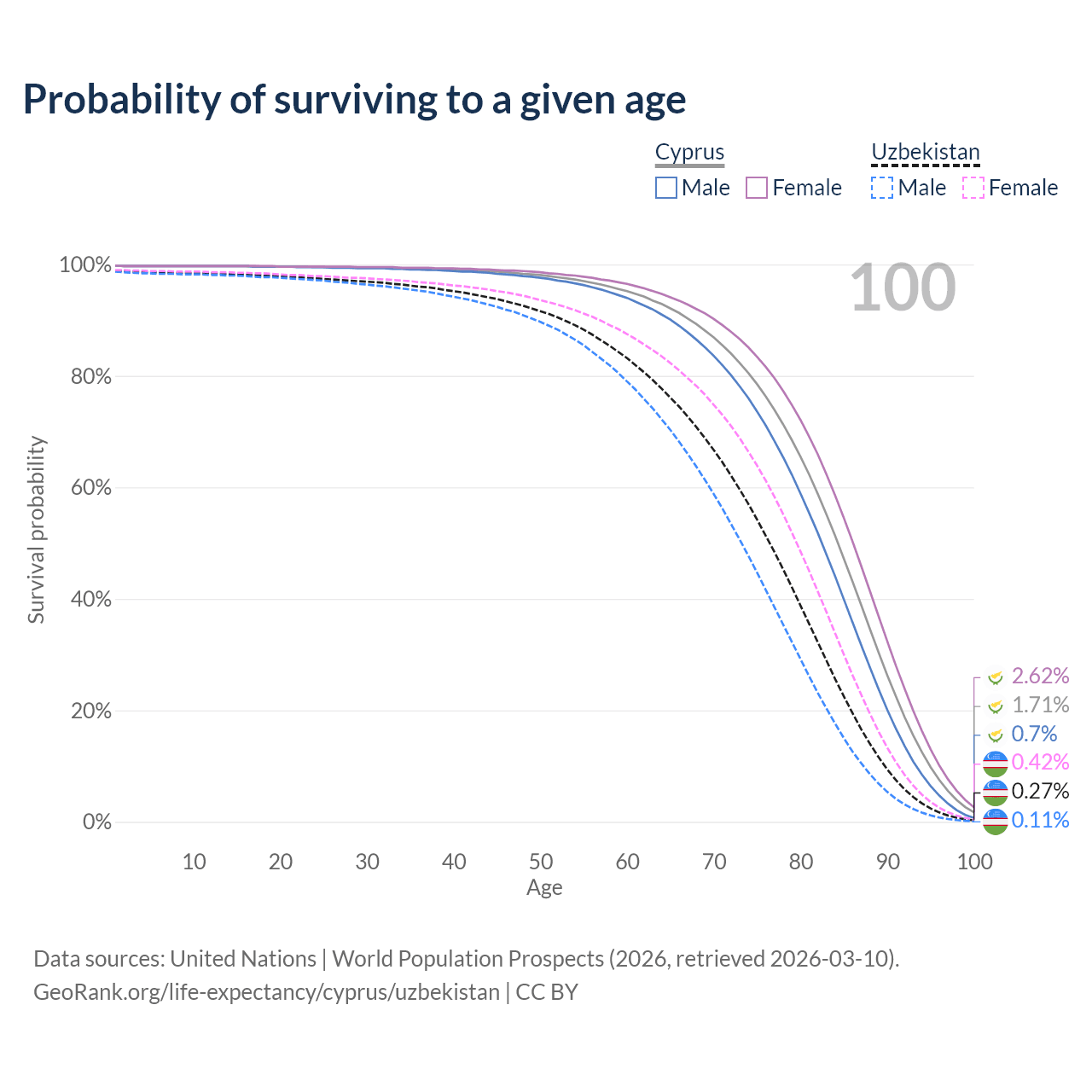 This life expectancy calculator shows the odds of living to 100, 95, 90, and below based on current age for both males and females in Cyprus and Uzbekistan, along with mean and median age of death. The calculations are based on the 2026 life tables (actuarial tables) from the UN World Population Prospects.
