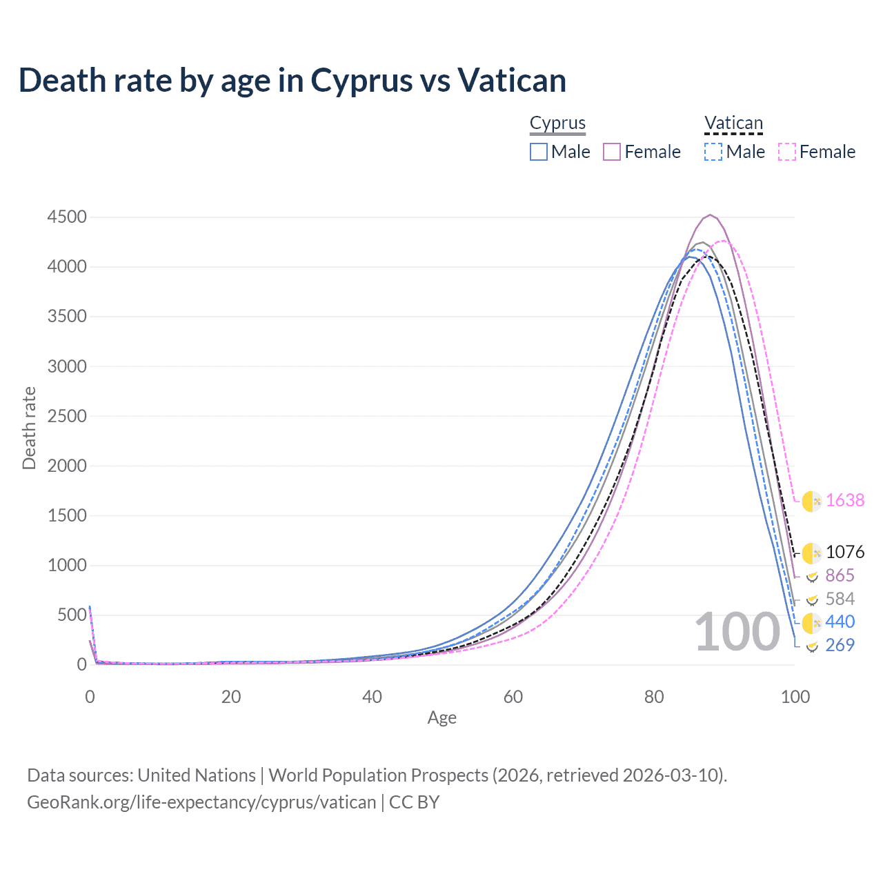 In Cyprus, the most common age of death is 87, compared to 88 in the Vatican. The median age of death is 84.3 in Cyprus and 85.7 in the Vatican, meaning only half of each cohort is expected to live past that age.