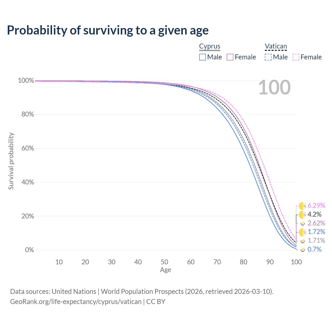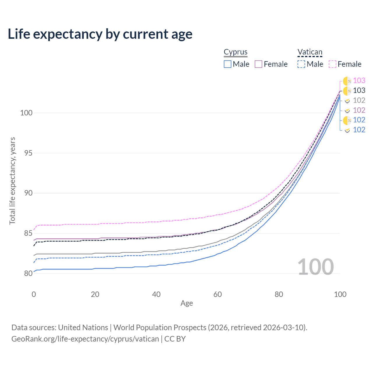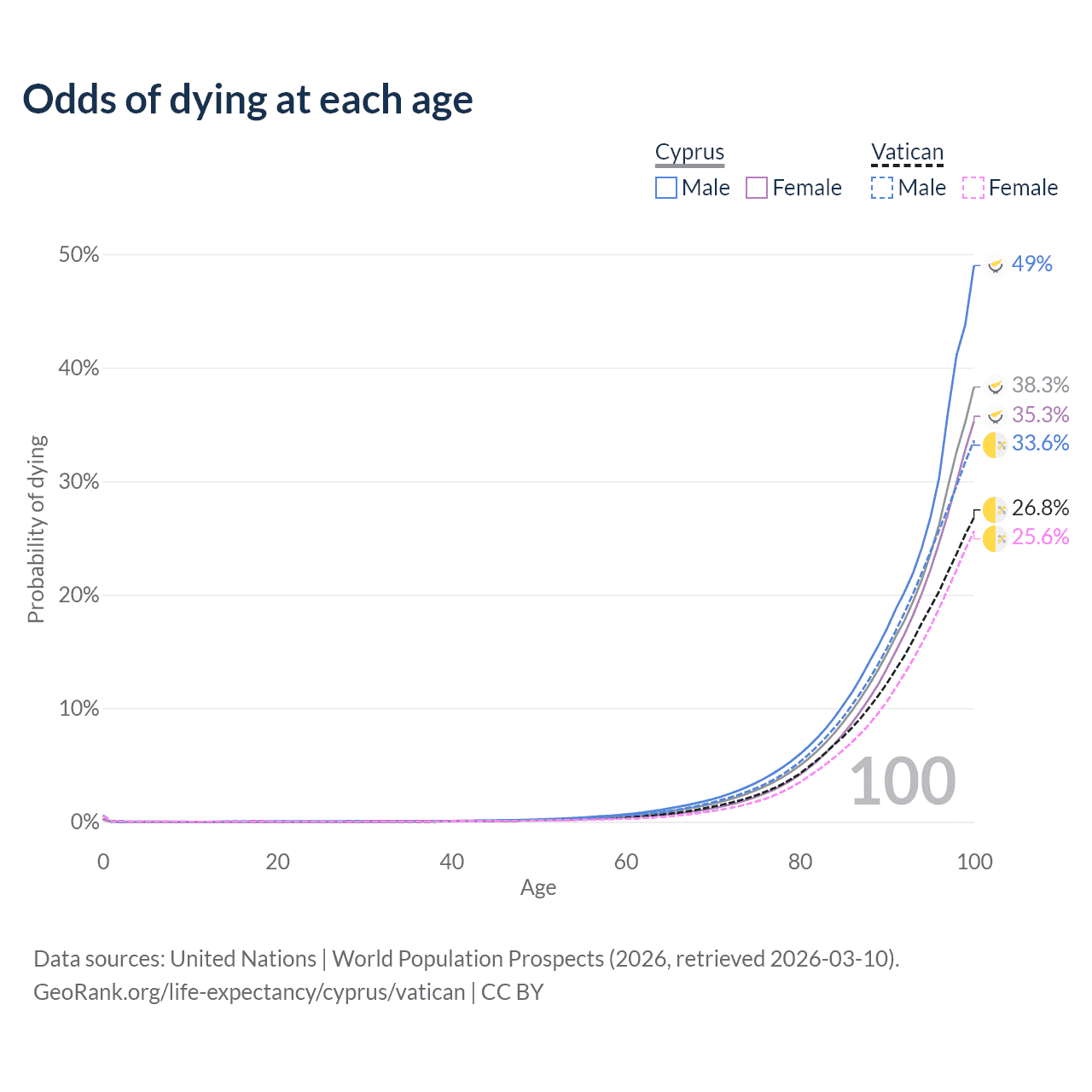 This life expectancy calculator shows the odds of living to 100, 95, 90, and below based on current age for both males and females in Cyprus and the Vatican, along with mean and median age of death. The calculations are based on the 2026 life tables (actuarial tables) from the UN World Population Prospects.