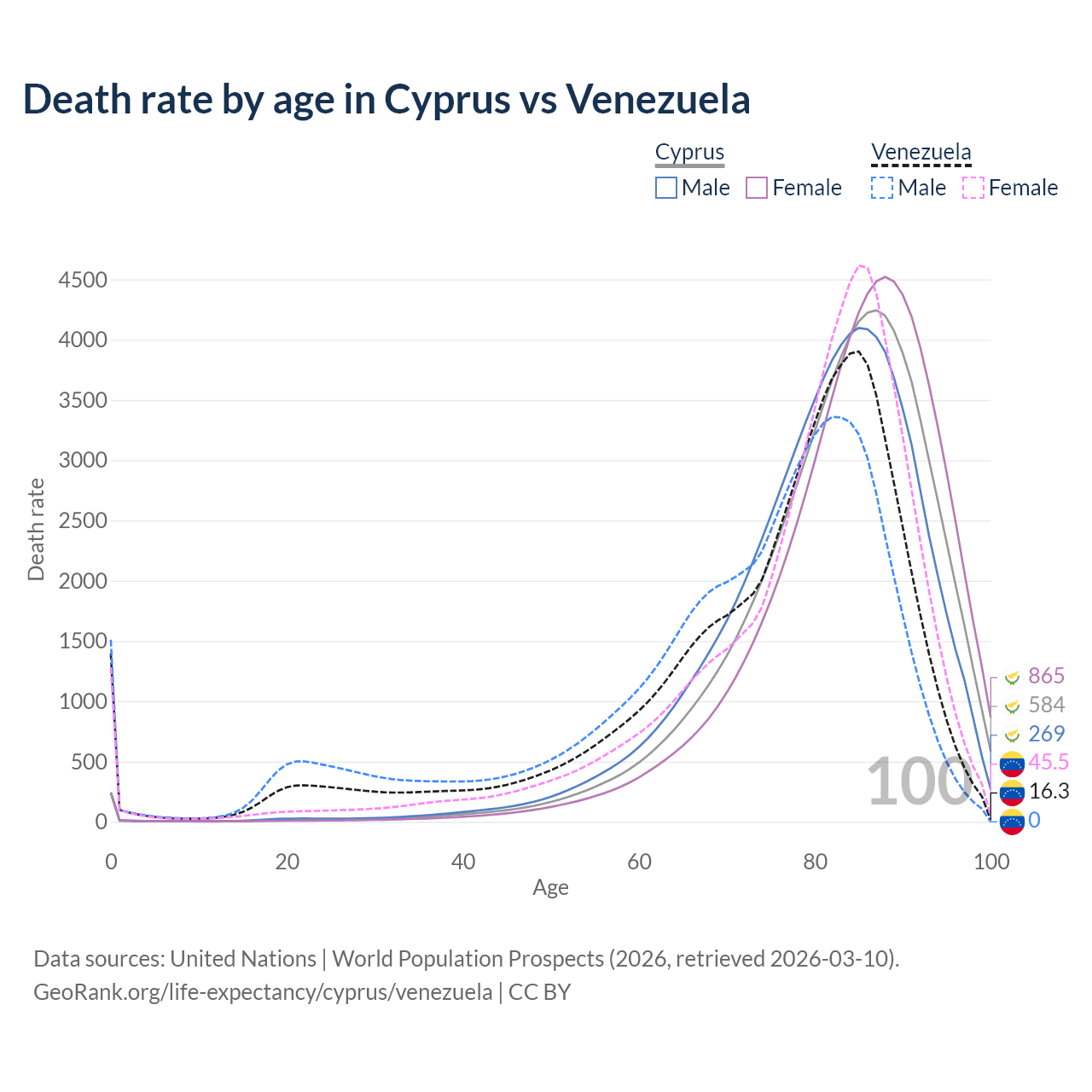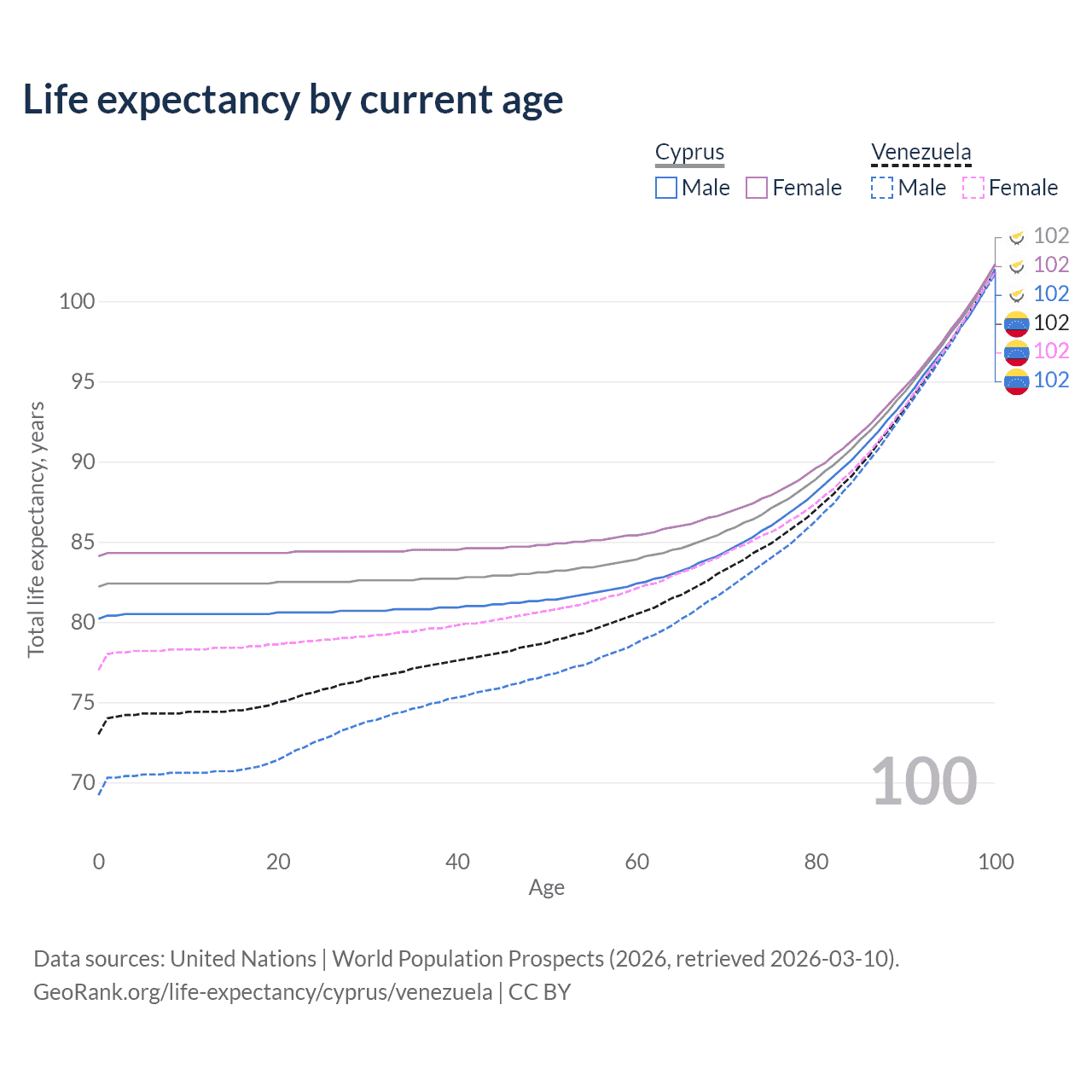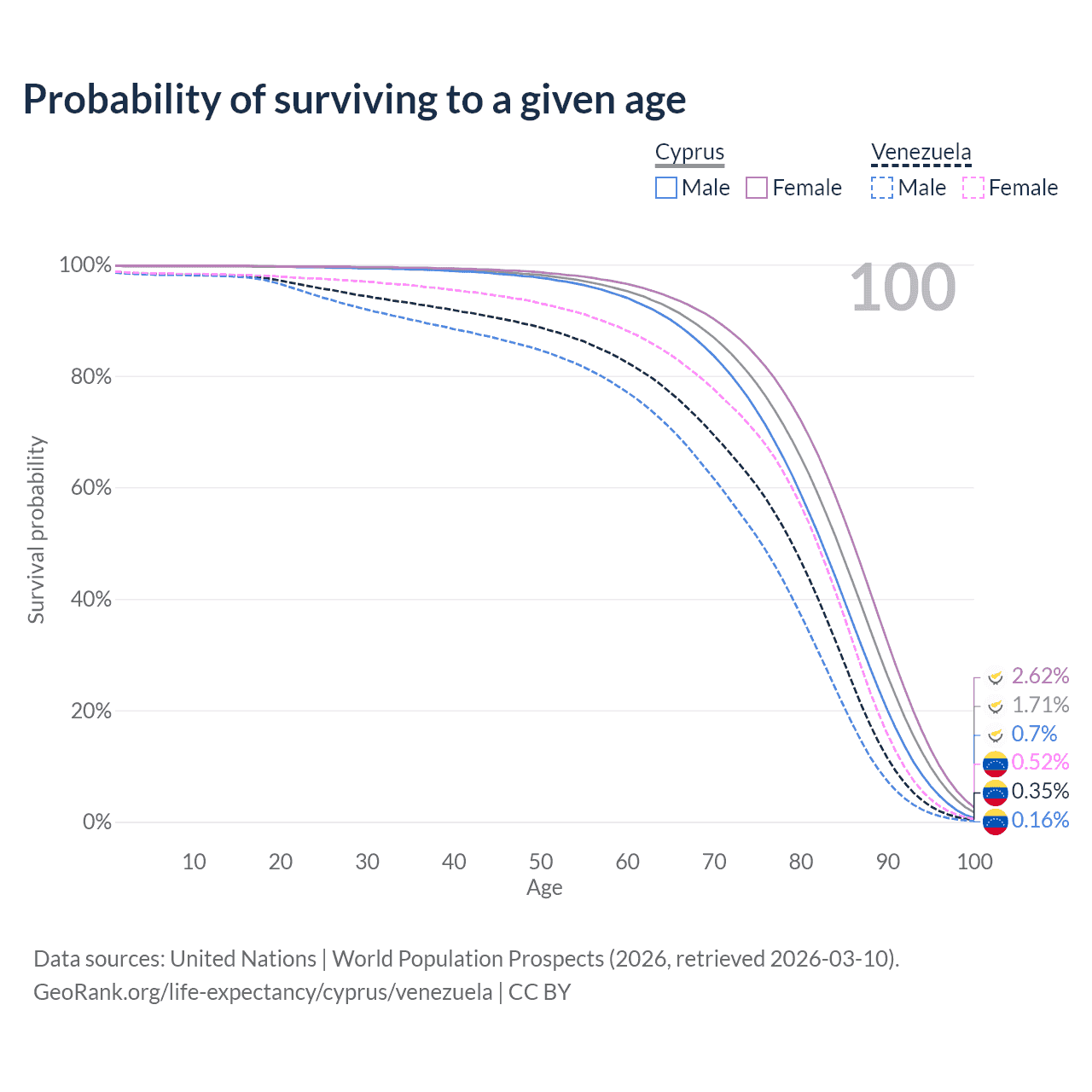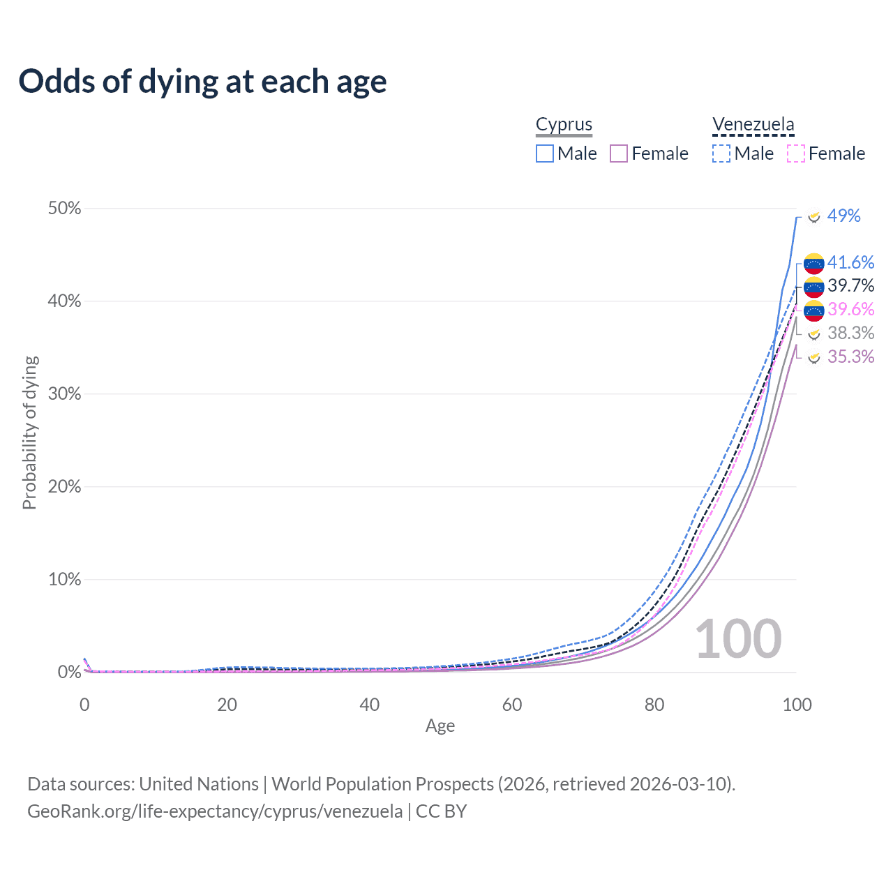 This life expectancy calculator shows the odds of living to 100, 95, 90, and below based on current age for both males and females in Cyprus and Venezuela, along with mean and median age of death. The calculations are based on the 2026 life tables (actuarial tables) from the UN World Population Prospects.