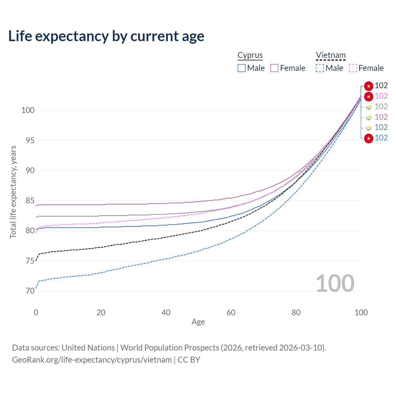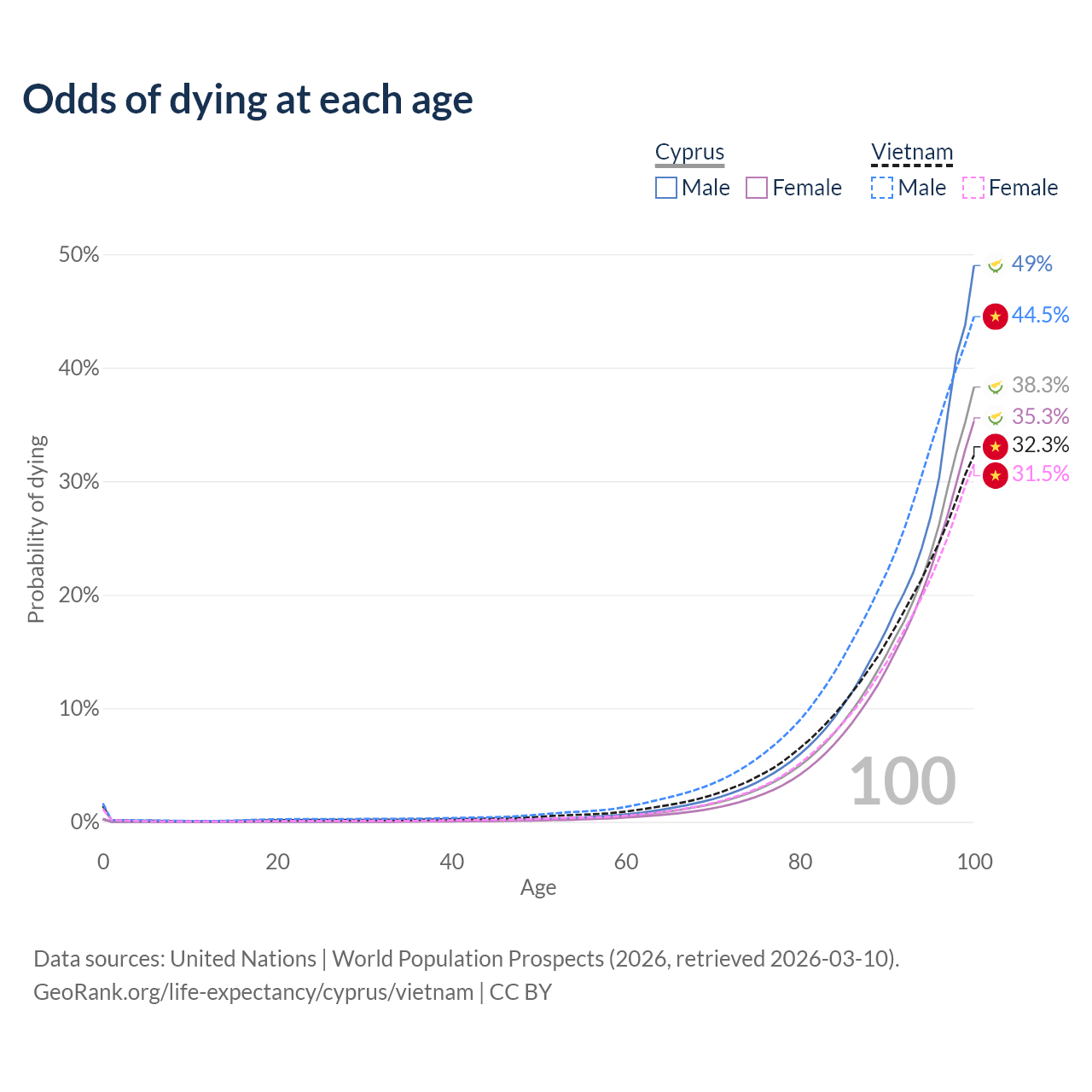 This life expectancy calculator shows the odds of living to 100, 95, 90, and below based on current age for both males and females in Cyprus and Vietnam, along with mean and median age of death. The calculations are based on the 2026 life tables (actuarial tables) from the UN World Population Prospects.