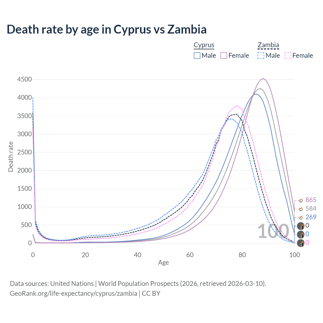 In Cyprus, the most common age of death is 87, compared to 0 in Zambia. The median age of death is 84.3 in Cyprus and 73.1 in Zambia, meaning only half of each cohort is expected to live past that age.