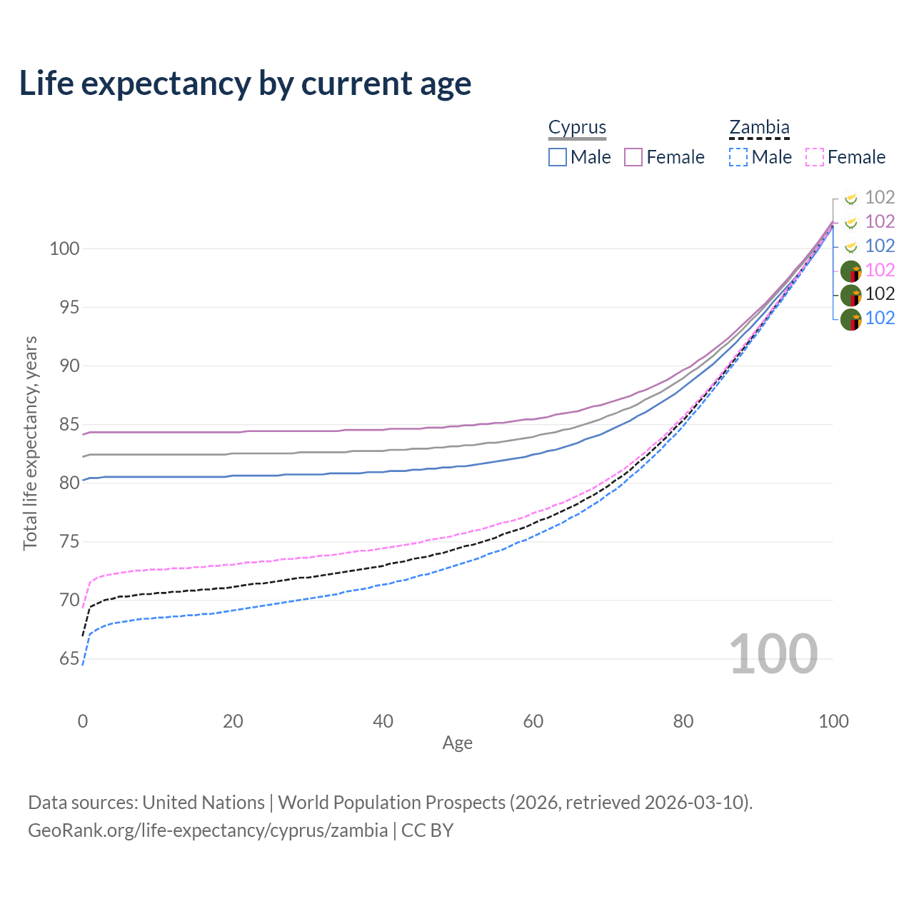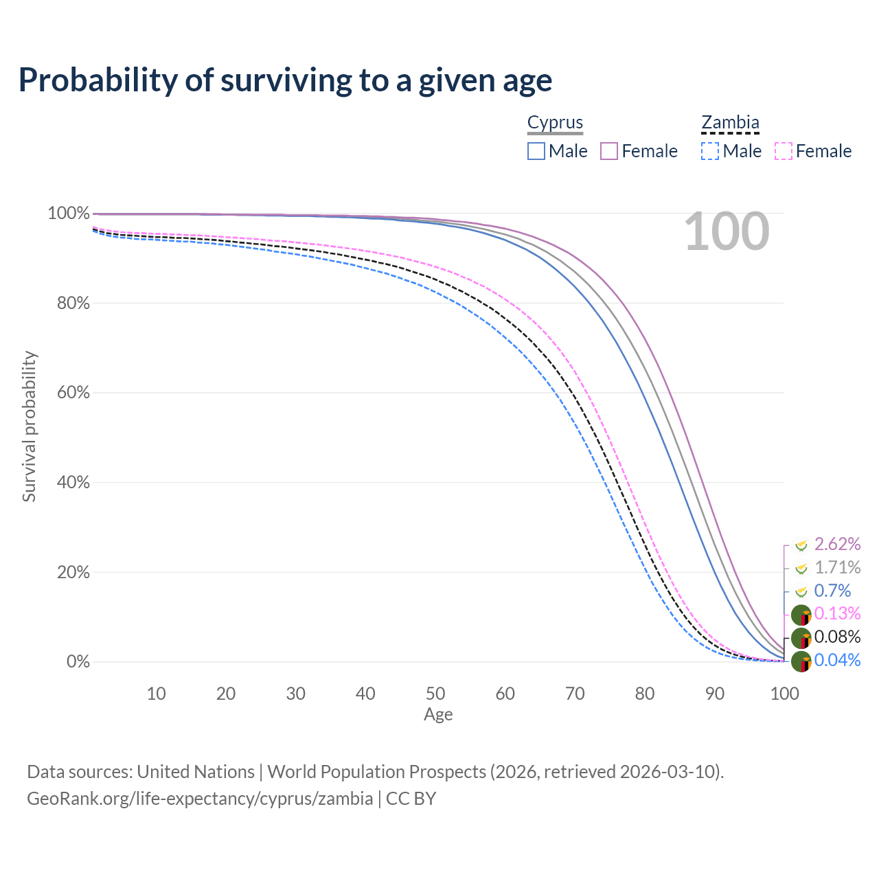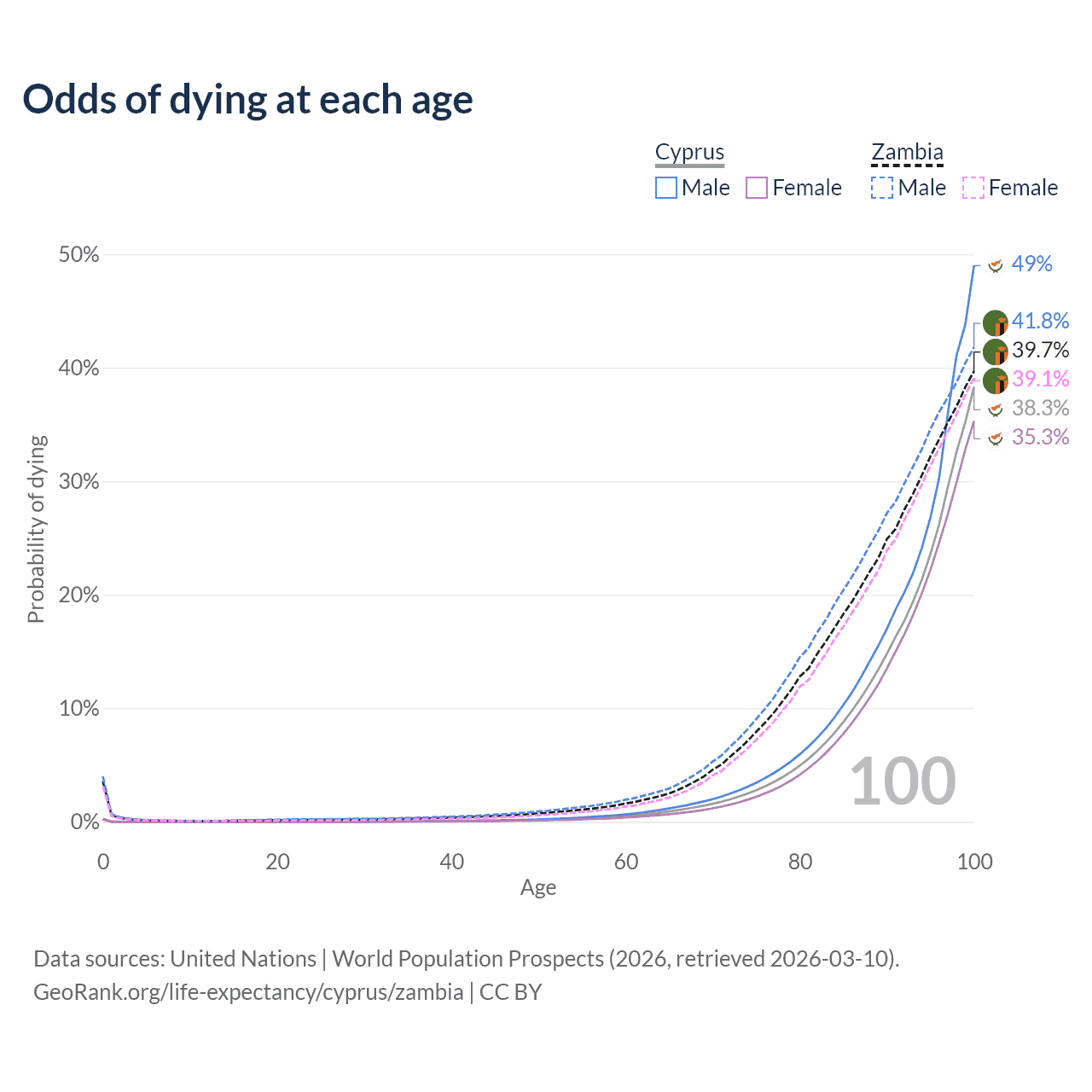 This life expectancy calculator shows the odds of living to 100, 95, 90, and below based on current age for both males and females in Cyprus and Zambia, along with mean and median age of death. The calculations are based on the 2026 life tables (actuarial tables) from the UN World Population Prospects.