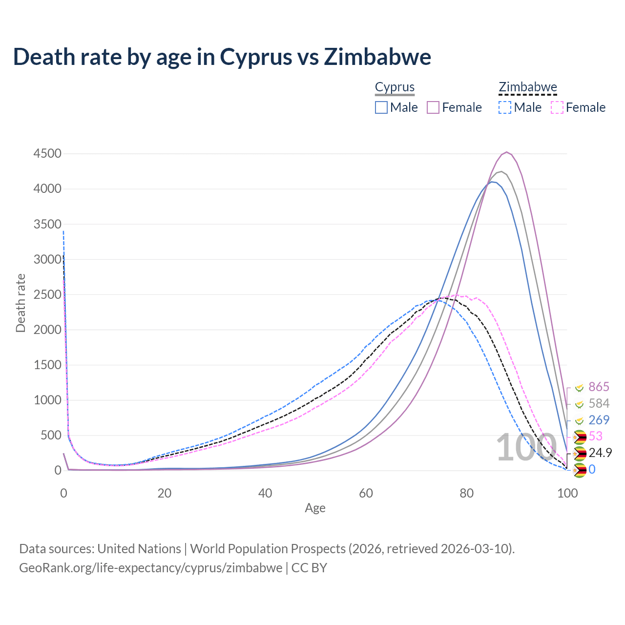 In Cyprus, the most common age of death is 87, compared to 0 in Zimbabwe. The median age of death is 84.3 in Cyprus and 68.8 in Zimbabwe, meaning only half of each cohort is expected to live past that age.