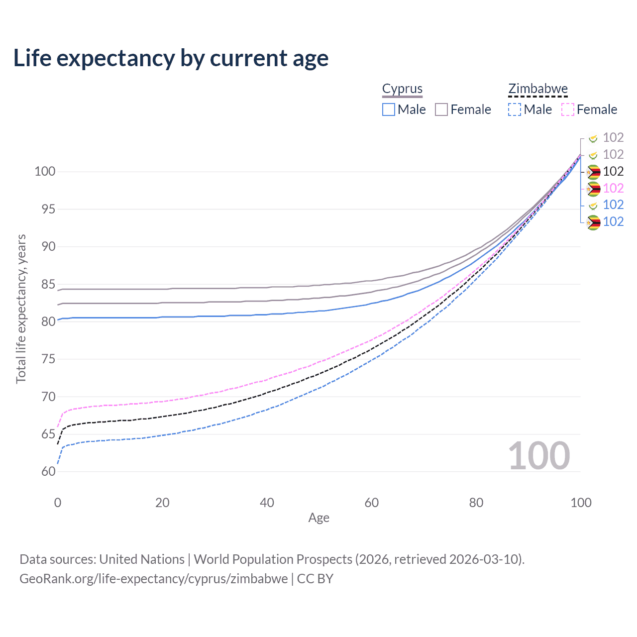 The average life expectancy at birth is 82.2 years in Cyprus vs 63.6 in Zimbabwe. Cyprus is ranked 32/197 by life expectancy, and Zimbabwe is 180/197. In Cyprus, the life expectancy is 80.2 years for males and 84.1 years for females. In Zimbabwe, it's 61 years for males and 65.9 years for females.