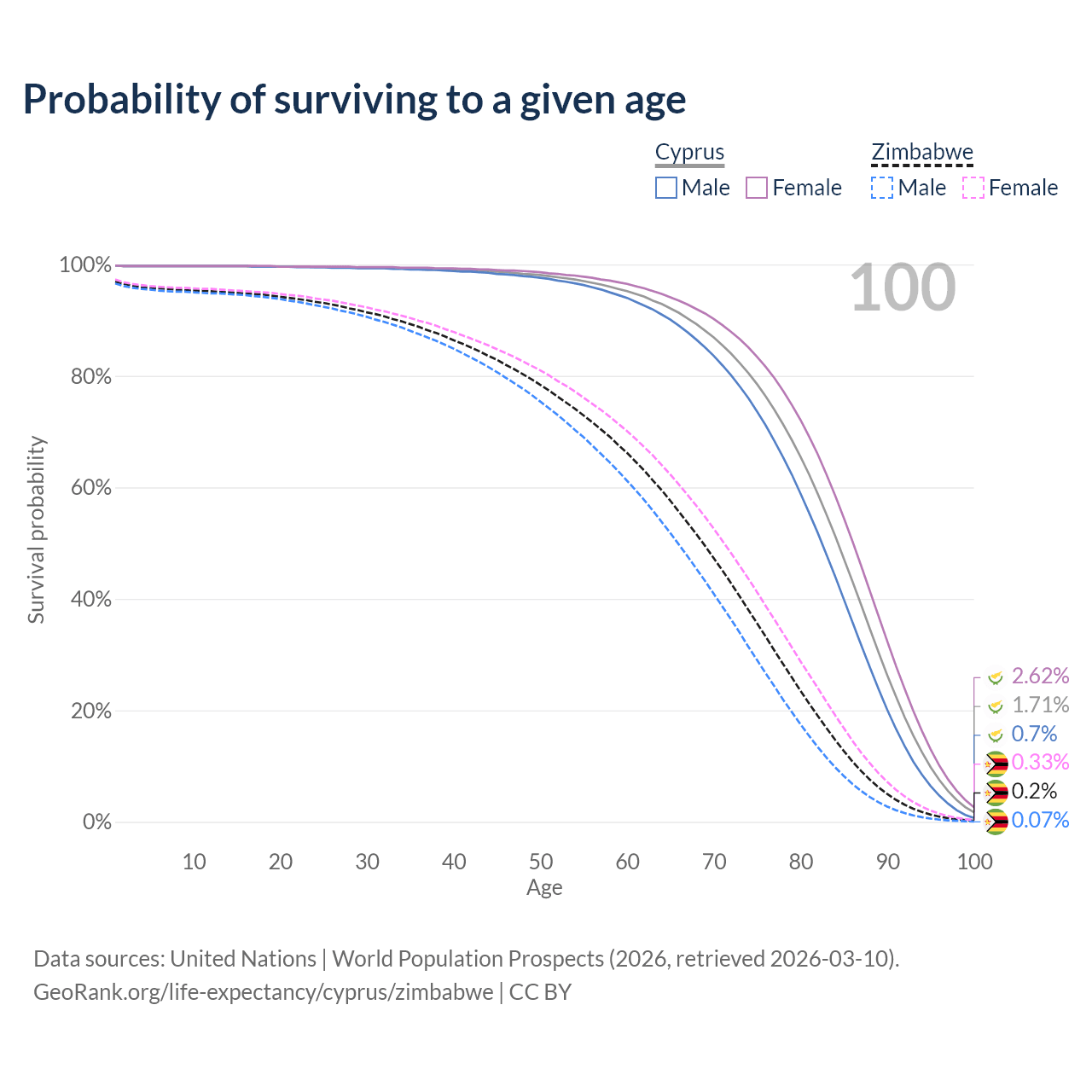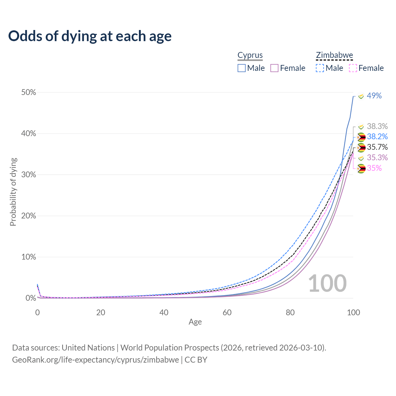 This life expectancy calculator shows the odds of living to 100, 95, 90, and below based on current age for both males and females in Cyprus and Zimbabwe, along with mean and median age of death. The calculations are based on the 2026 life tables (actuarial tables) from the UN World Population Prospects.