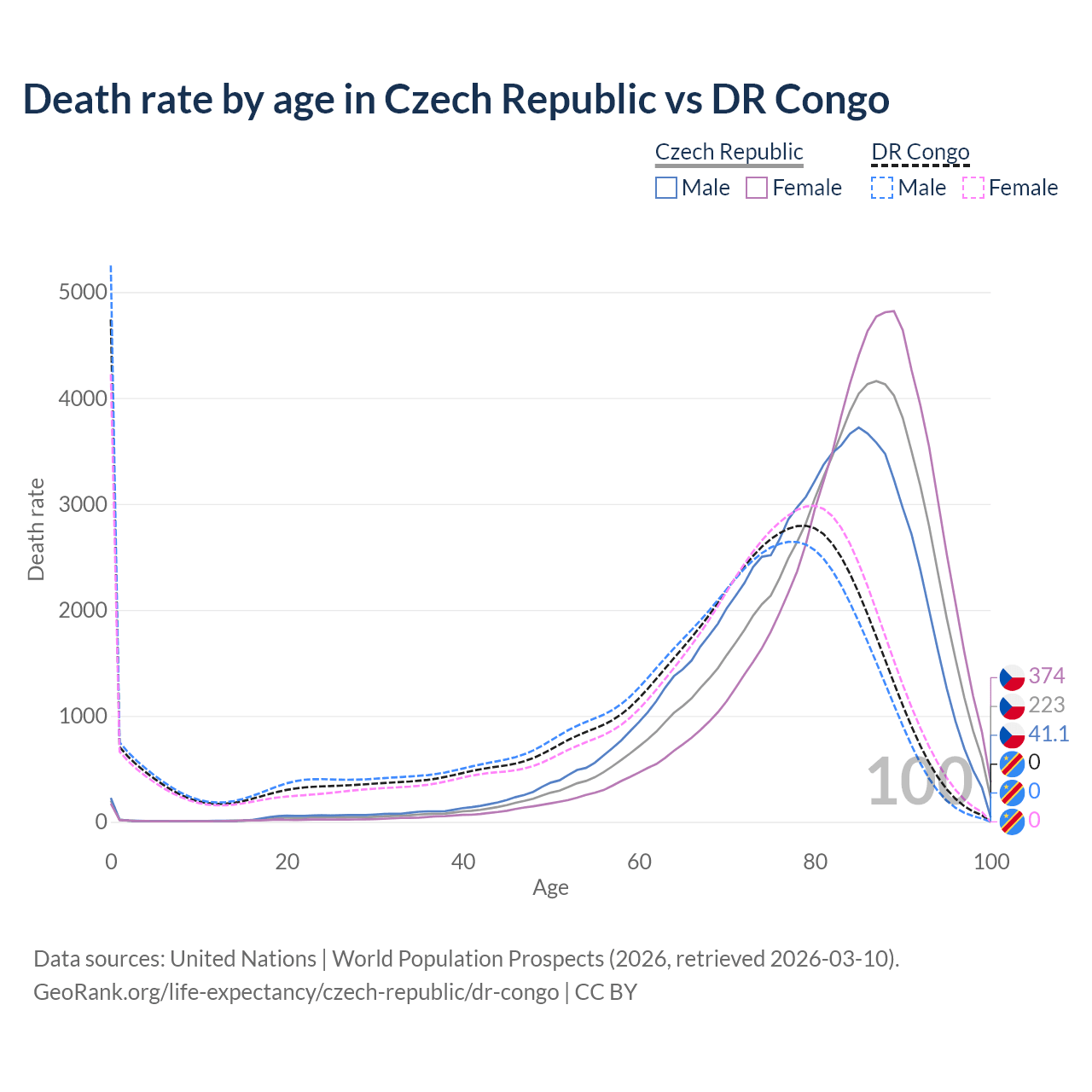 In the Czech Republic, the most common age of death is 87, compared to 0 in the DR Congo. The median age of death is 83.2 in the Czech Republic and 70.9 in the DR Congo, meaning only half of each cohort is expected to live past that age.