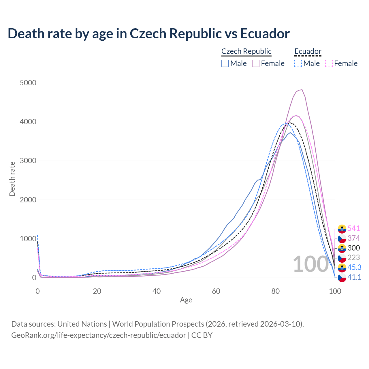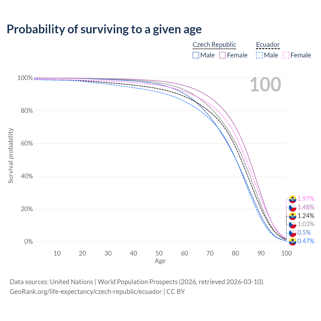This life expectancy calculator shows the odds of living to 100, 95, 90, and below based on current age for both males and females in the Czech Republic and Ecuador, along with mean and median age of death. The calculations are based on the 2026 life tables (actuarial tables) from the UN World Population Prospects.