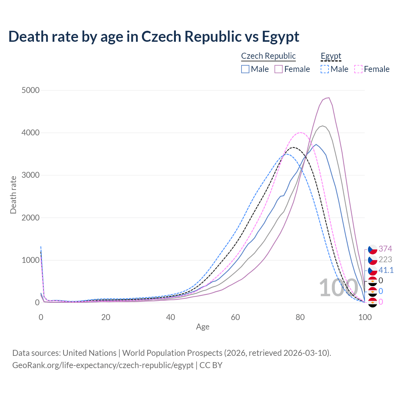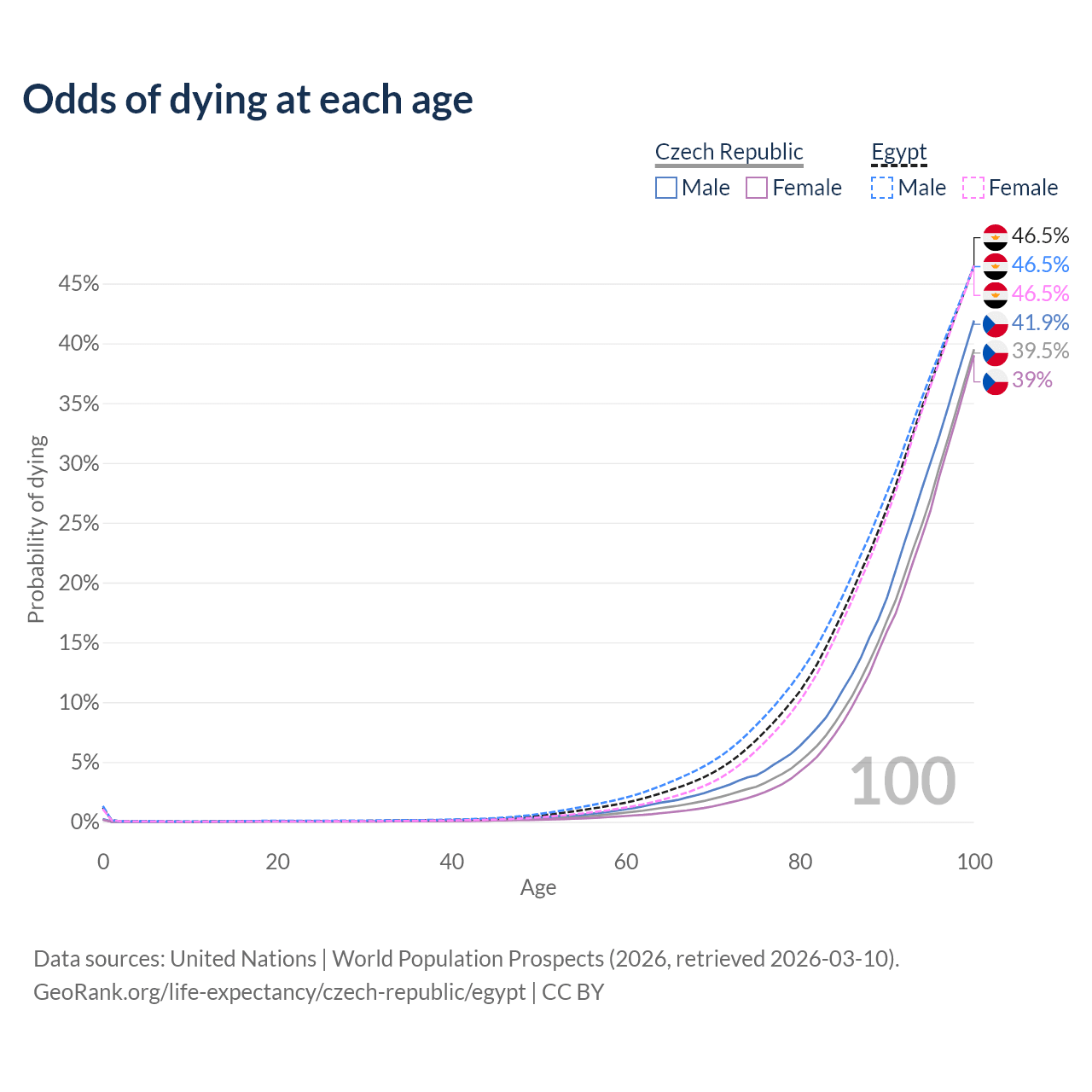 This life expectancy calculator shows the odds of living to 100, 95, 90, and below based on current age for both males and females in the Czech Republic and Egypt, along with mean and median age of death. The calculations are based on the 2026 life tables (actuarial tables) from the UN World Population Prospects.