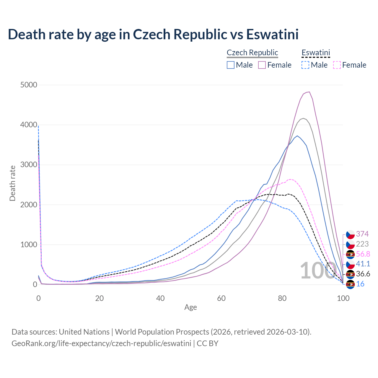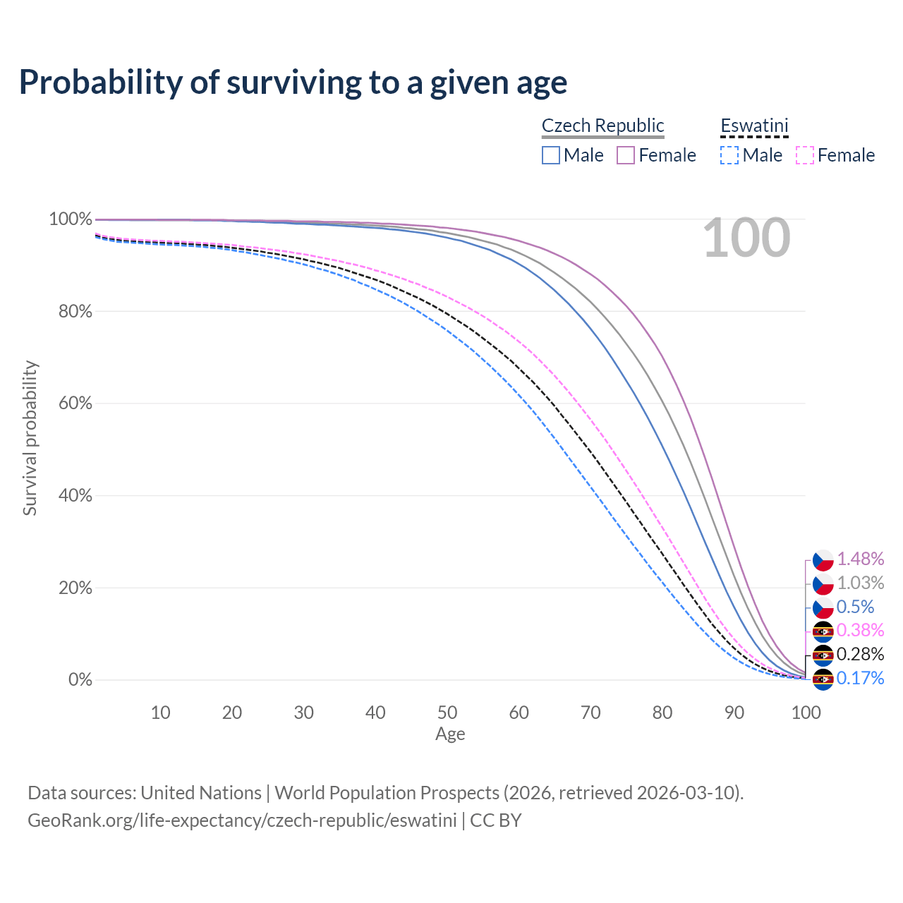 This life expectancy calculator shows the odds of living to 100, 95, 90, and below based on current age for both males and females in the Czech Republic and Eswatini, along with mean and median age of death. The calculations are based on the 2026 life tables (actuarial tables) from the UN World Population Prospects.