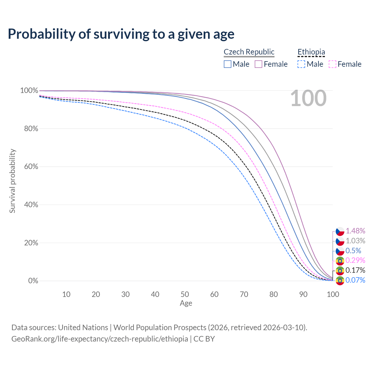 This life expectancy calculator shows the odds of living to 100, 95, 90, and below based on current age for both males and females in the Czech Republic and Ethiopia, along with mean and median age of death. The calculations are based on the 2026 life tables (actuarial tables) from the UN World Population Prospects.
