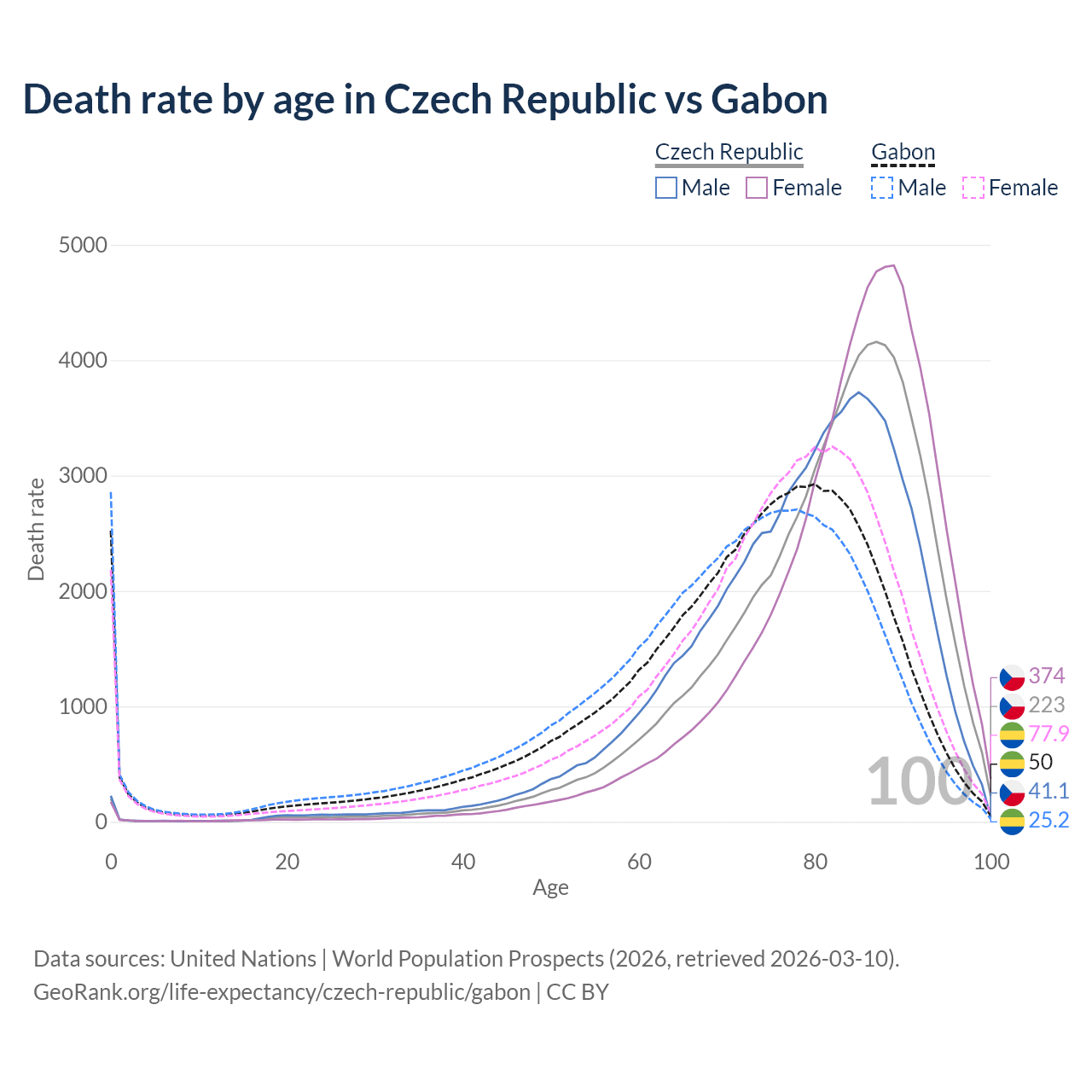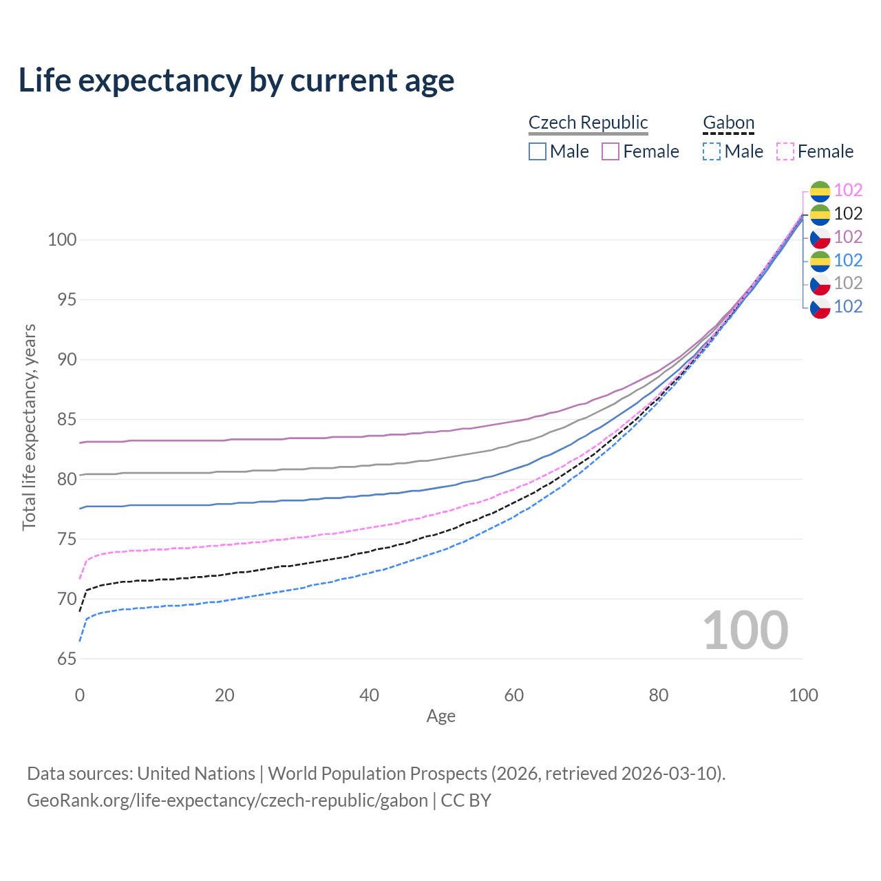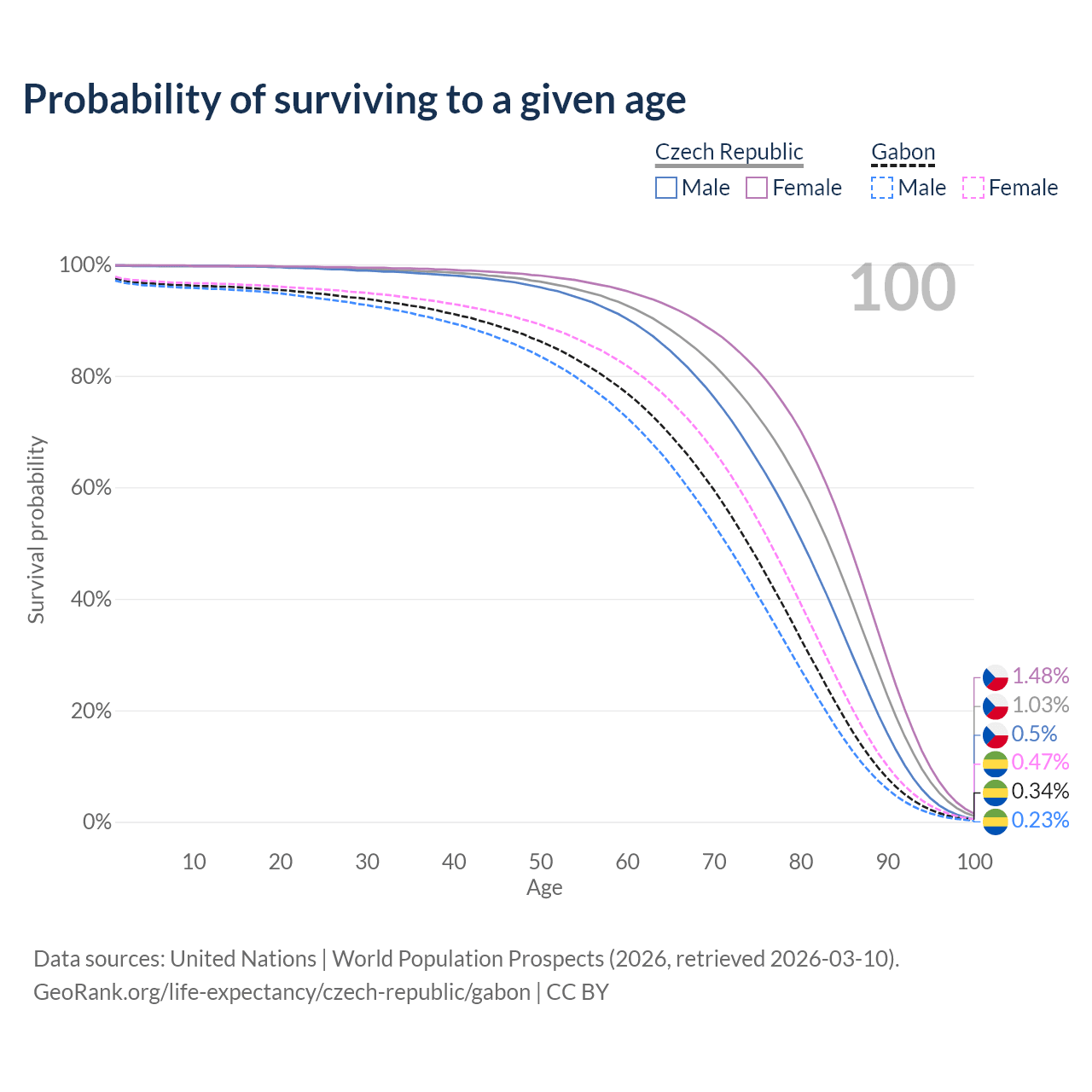 This life expectancy calculator shows the odds of living to 100, 95, 90, and below based on current age for both males and females in the Czech Republic and Gabon, along with mean and median age of death. The calculations are based on the 2026 life tables (actuarial tables) from the UN World Population Prospects.