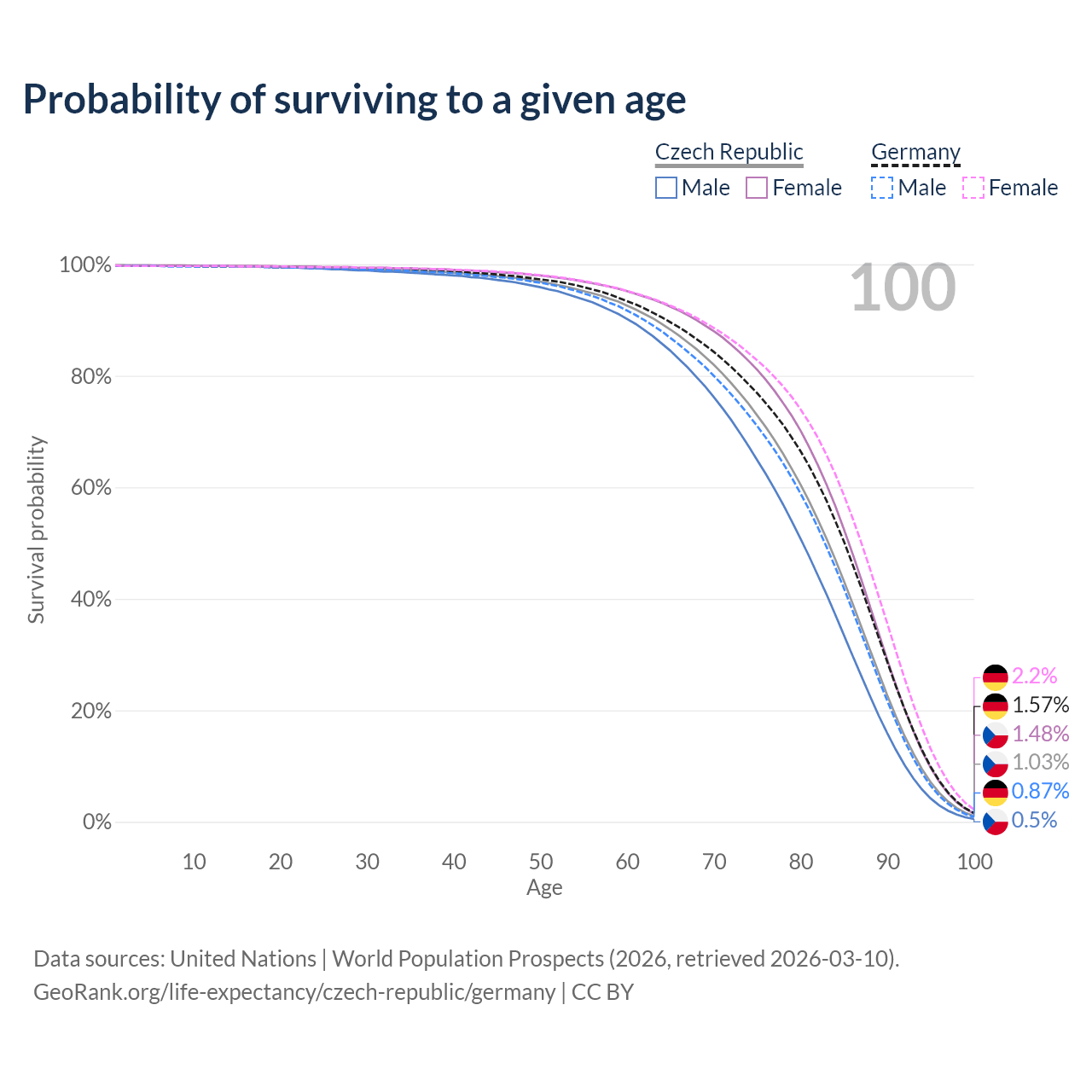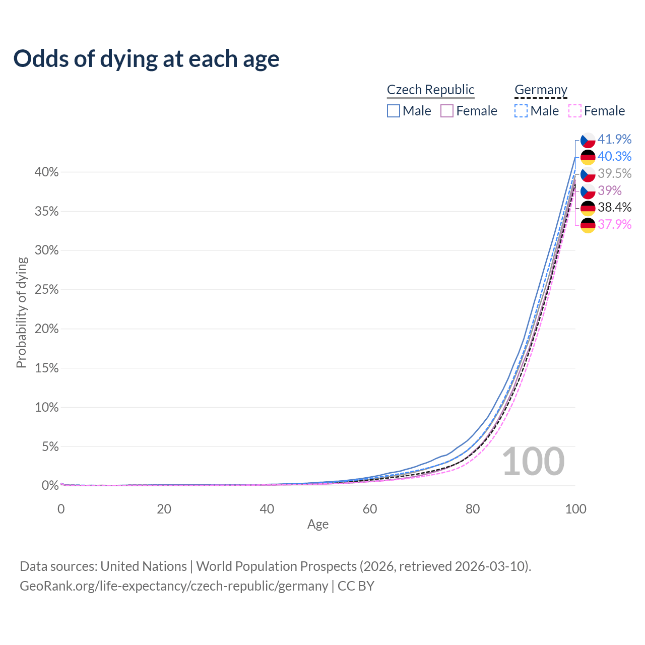 This life expectancy calculator shows the odds of living to 100, 95, 90, and below based on current age for both males and females in the Czech Republic and Germany, along with mean and median age of death. The calculations are based on the 2026 life tables (actuarial tables) from the UN World Population Prospects.