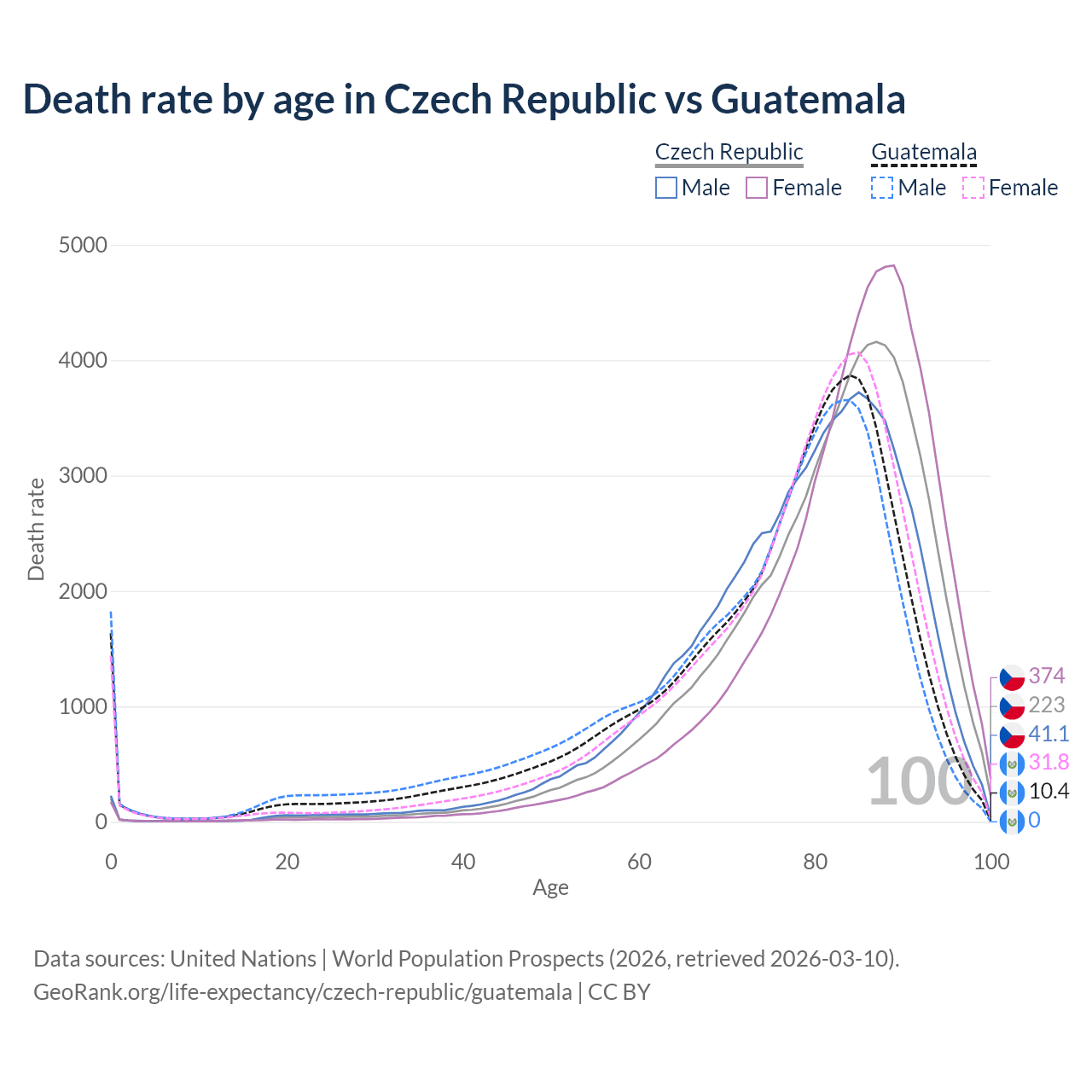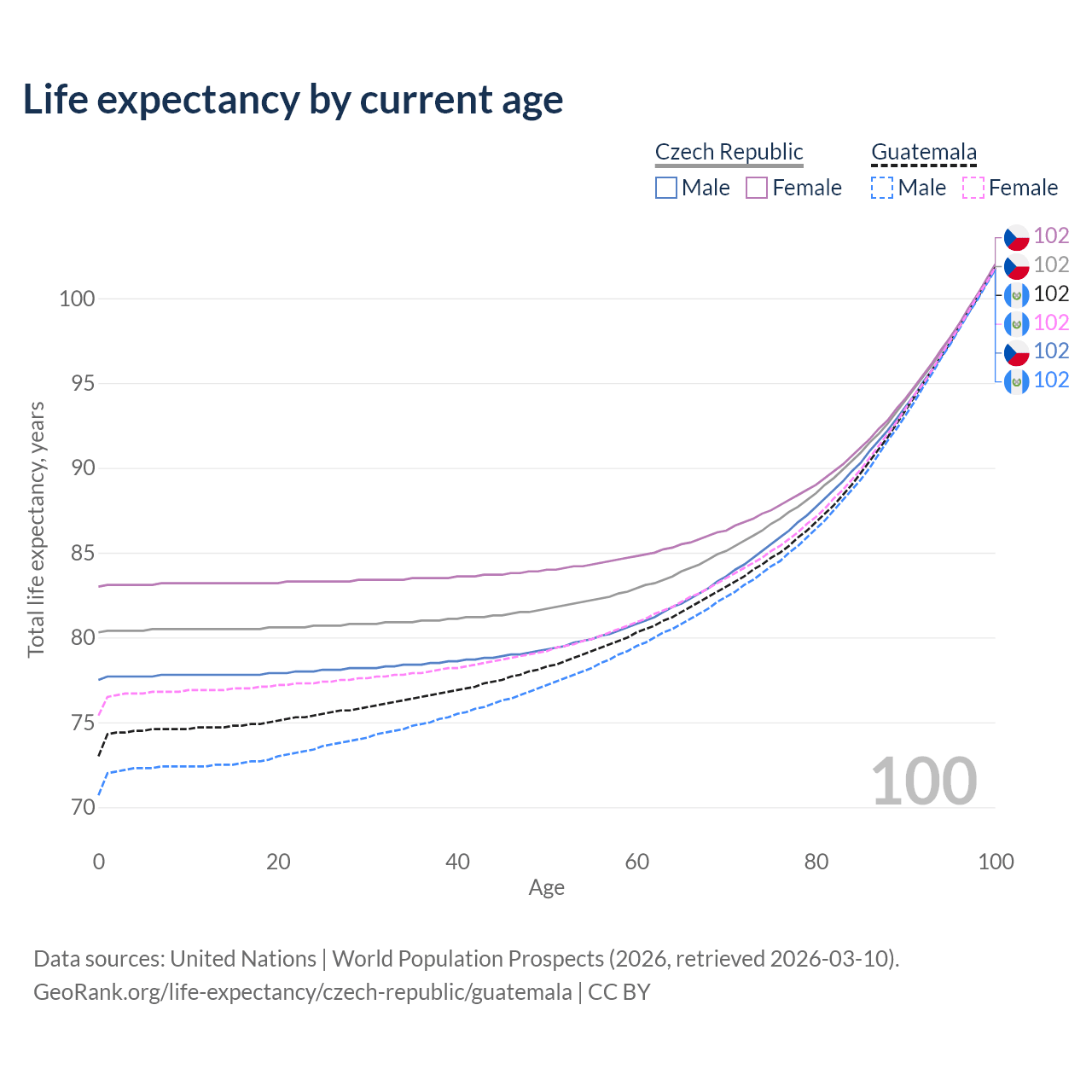 This life expectancy calculator shows the odds of living to 100, 95, 90, and below based on current age for both males and females in the Czech Republic and Guatemala, along with mean and median age of death. The calculations are based on the 2026 life tables (actuarial tables) from the UN World Population Prospects.