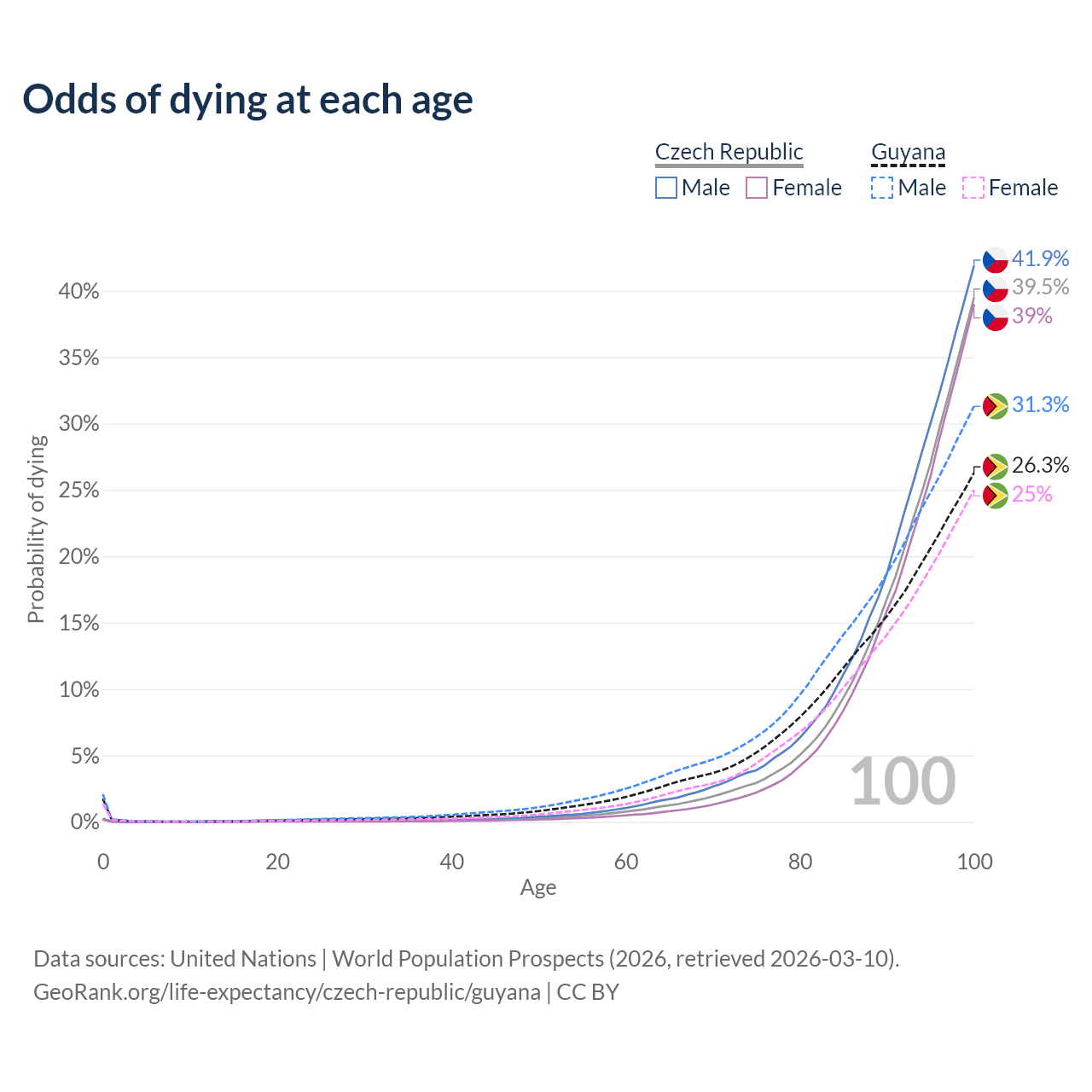 This life expectancy calculator shows the odds of living to 100, 95, 90, and below based on current age for both males and females in the Czech Republic and Guyana, along with mean and median age of death. The calculations are based on the 2026 life tables (actuarial tables) from the UN World Population Prospects.