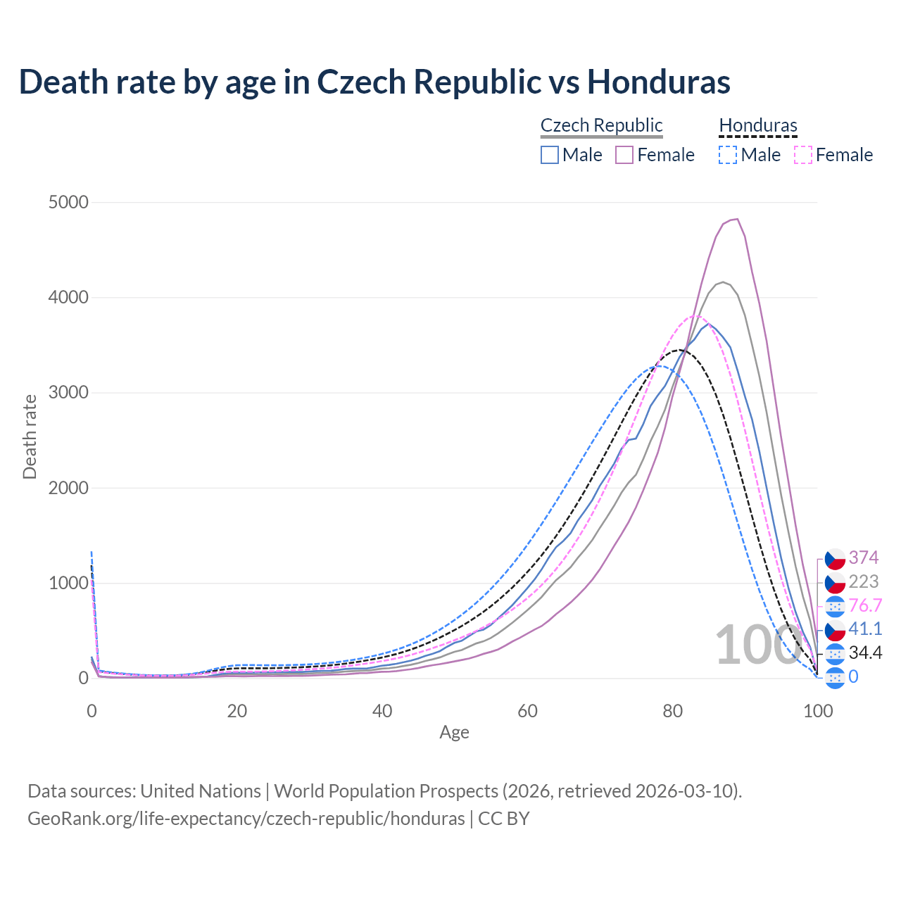 In the Czech Republic, the most common age of death is 87, compared to 81 in Honduras. The median age of death is 83.2 in the Czech Republic and 77.1 in Honduras, meaning only half of each cohort is expected to live past that age.