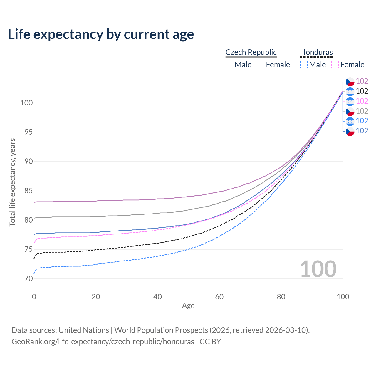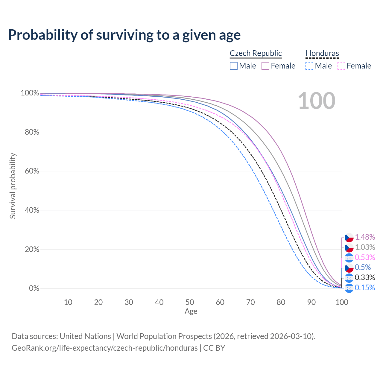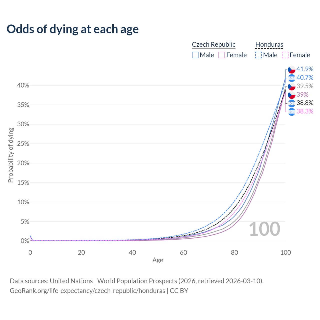 This life expectancy calculator shows the odds of living to 100, 95, 90, and below based on current age for both males and females in the Czech Republic and Honduras, along with mean and median age of death. The calculations are based on the 2026 life tables (actuarial tables) from the UN World Population Prospects.