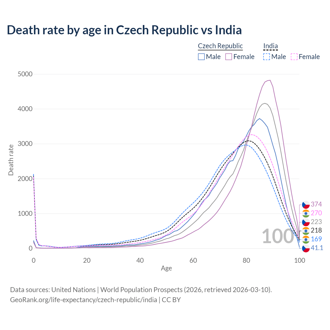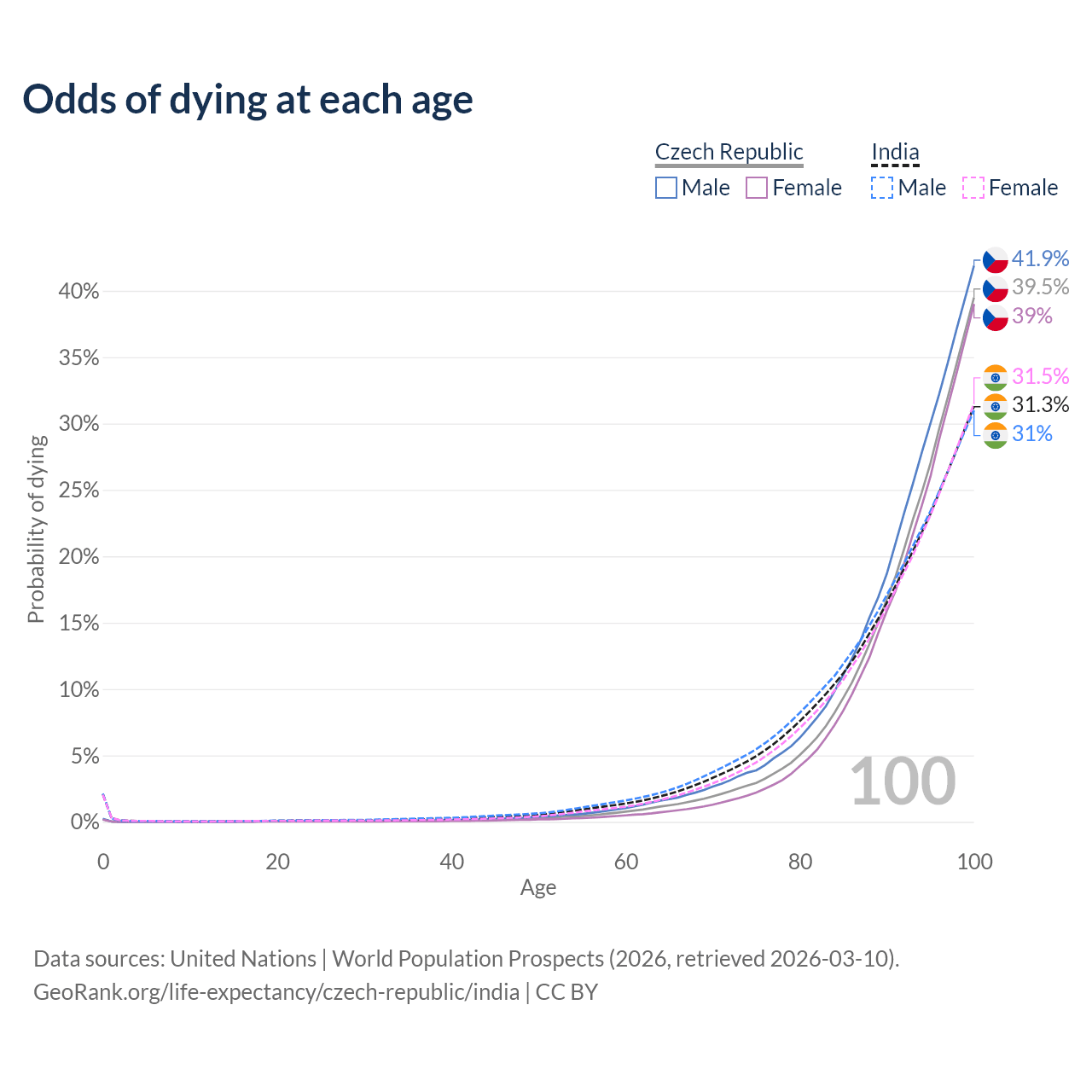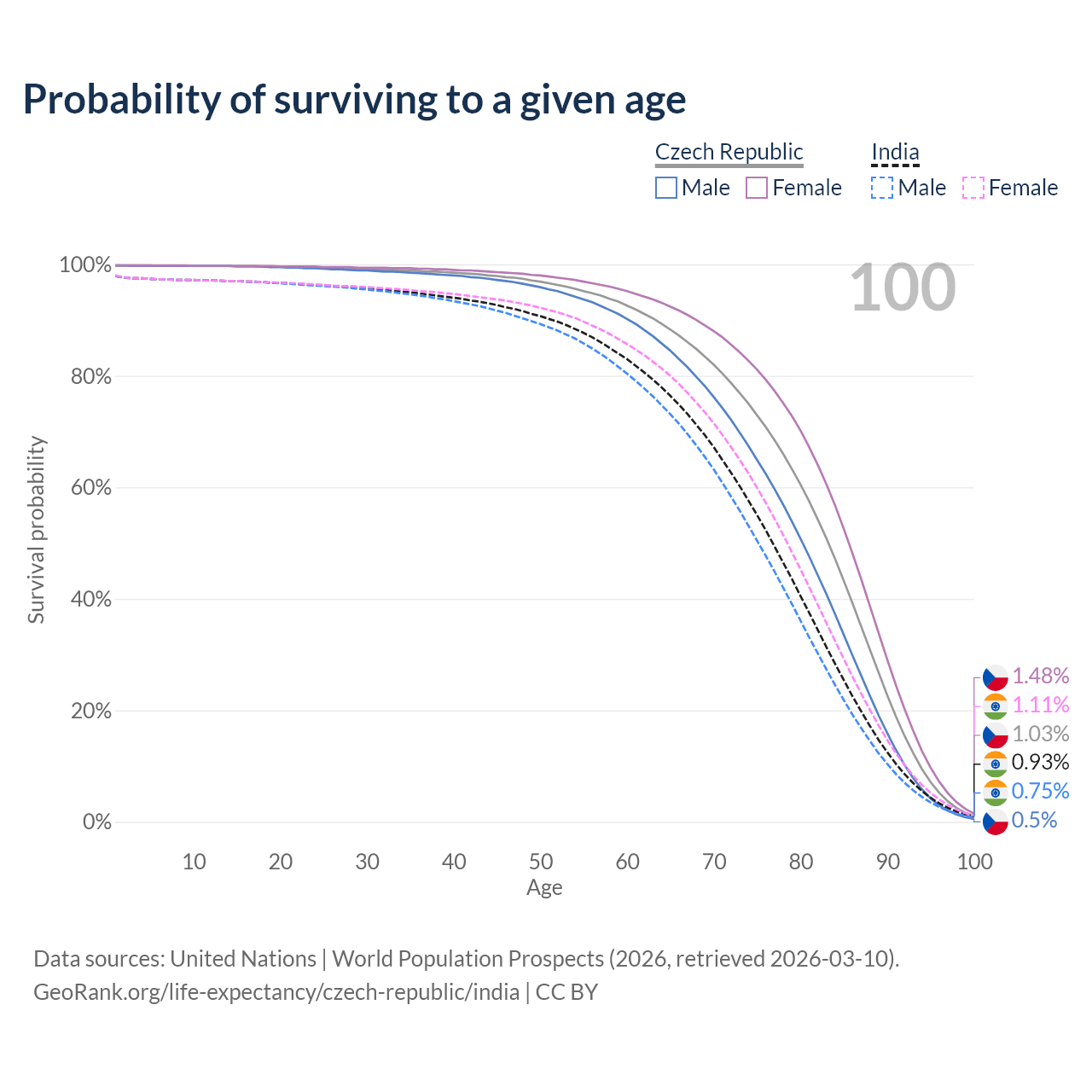 This life expectancy calculator shows the odds of living to 100, 95, 90, and below based on current age for both males and females in the Czech Republic and India, along with mean and median age of death. The calculations are based on the 2026 life tables (actuarial tables) from the UN World Population Prospects.