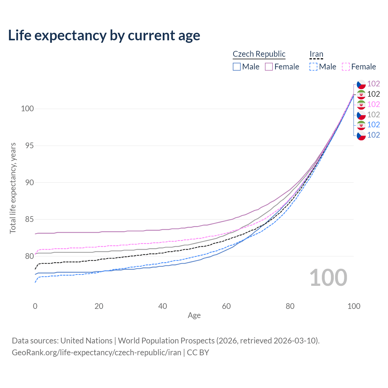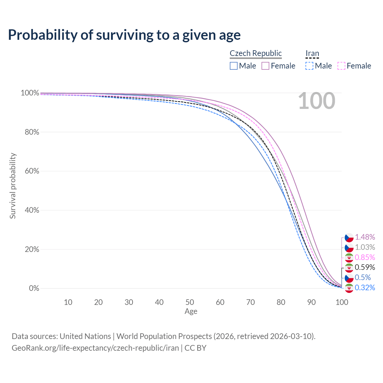 This life expectancy calculator shows the odds of living to 100, 95, 90, and below based on current age for both males and females in the Czech Republic and Iran, along with mean and median age of death. The calculations are based on the 2026 life tables (actuarial tables) from the UN World Population Prospects.