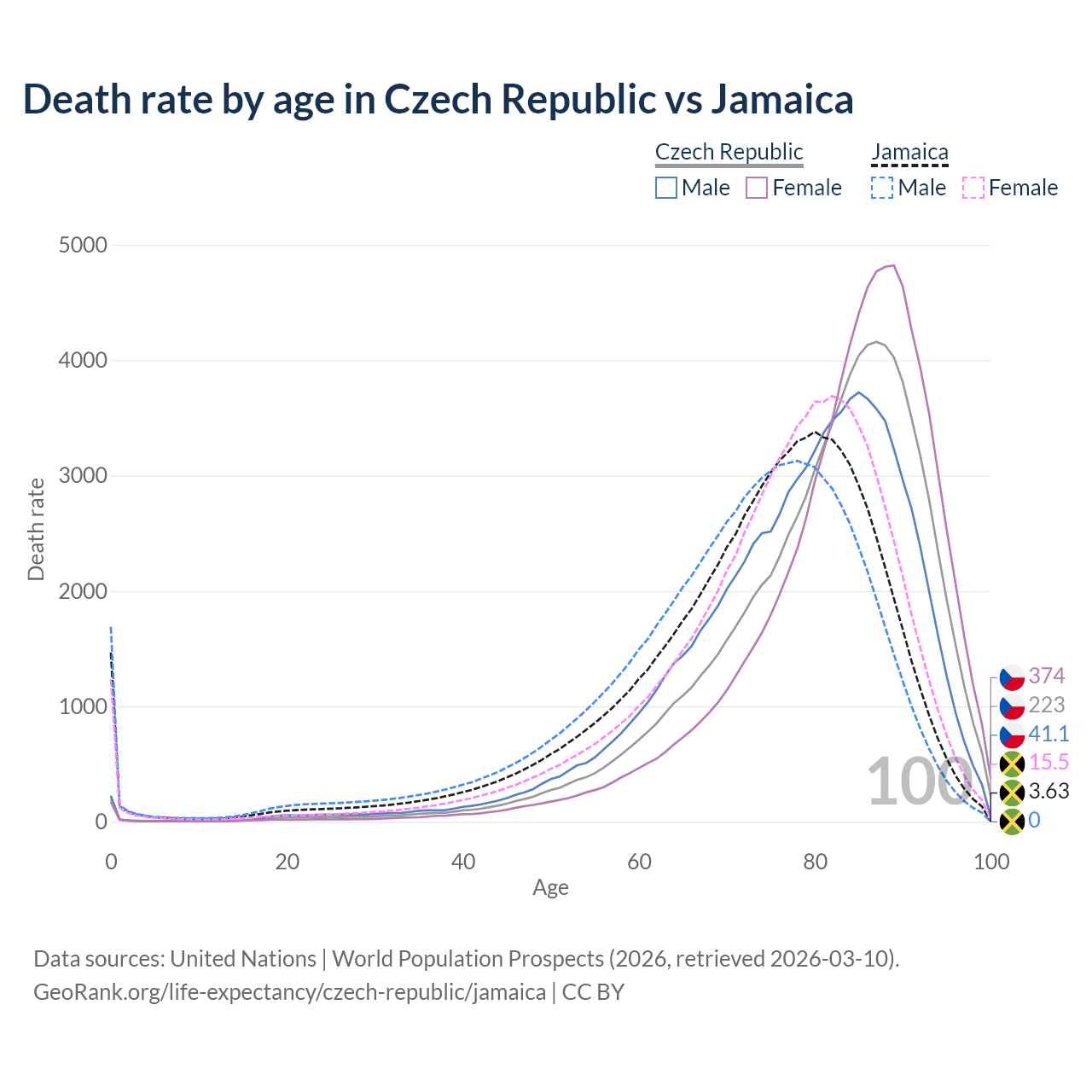 In the Czech Republic, the most common age of death is 87, compared to 80 in Jamaica. The median age of death is 83.2 in the Czech Republic and 75.7 in Jamaica, meaning only half of each cohort is expected to live past that age.