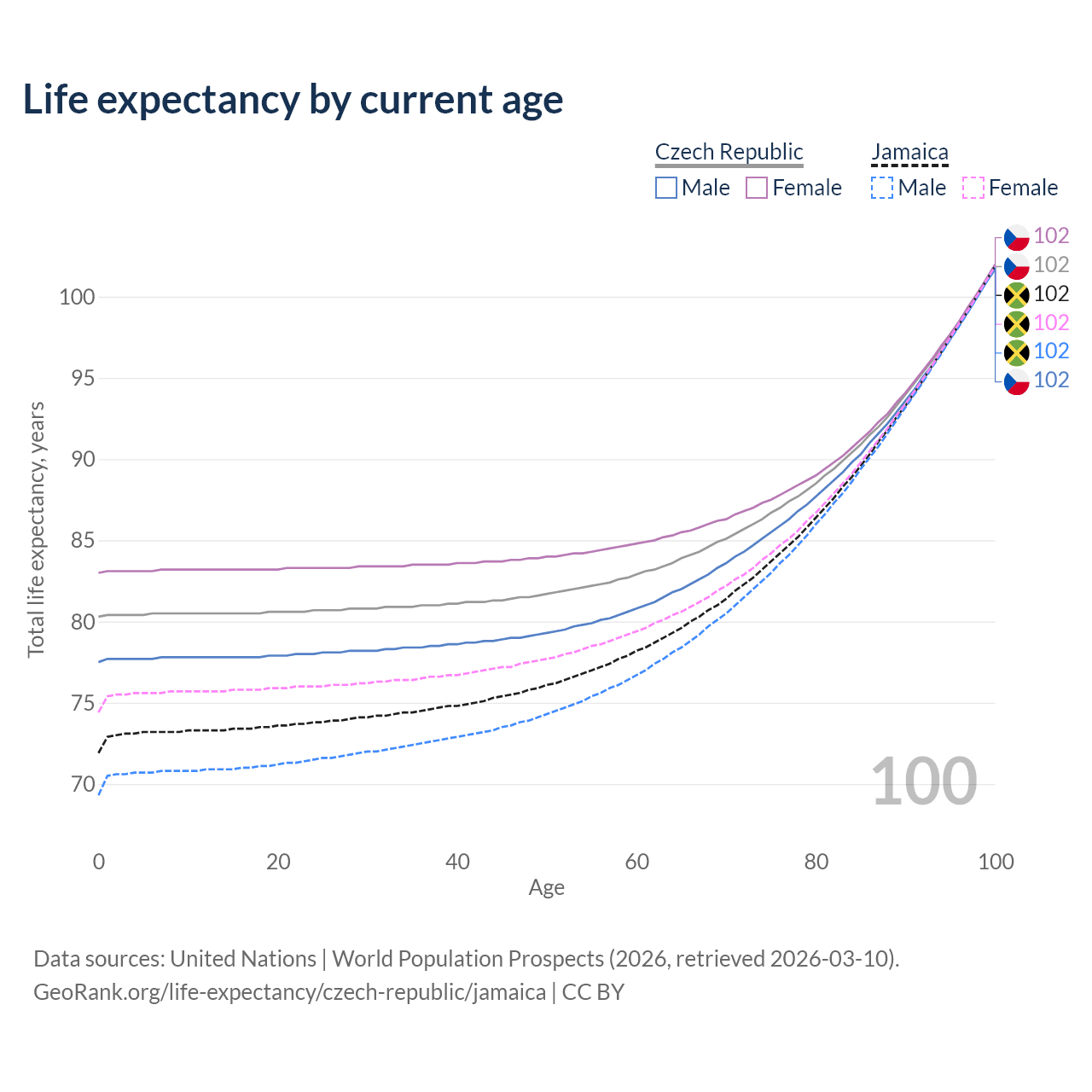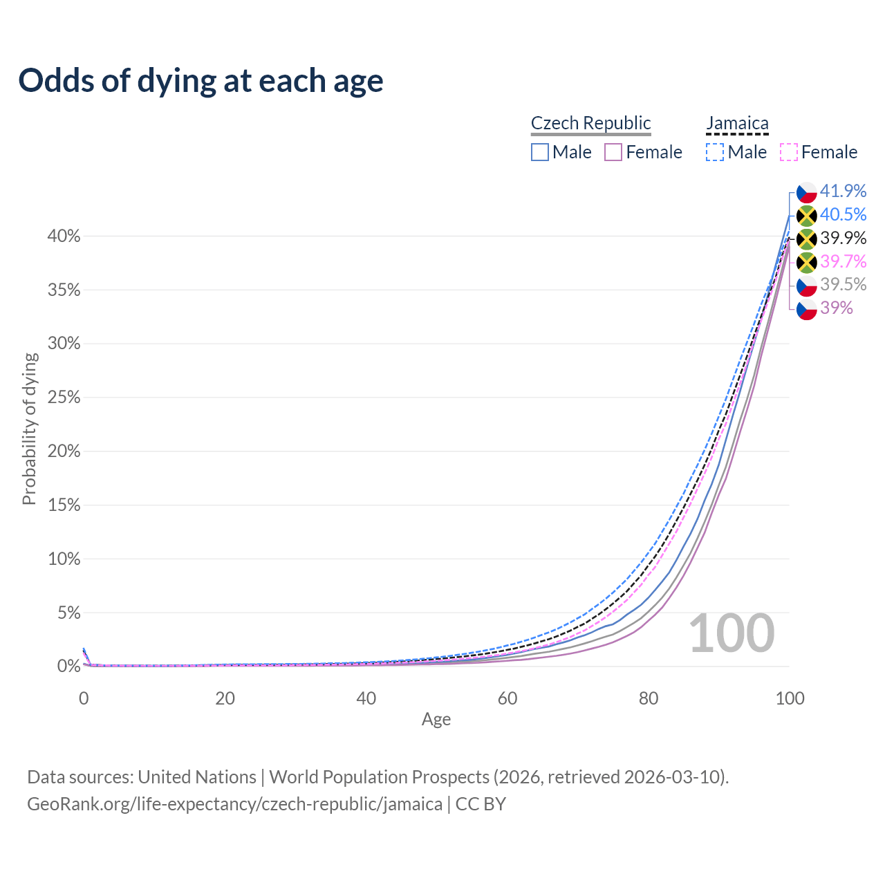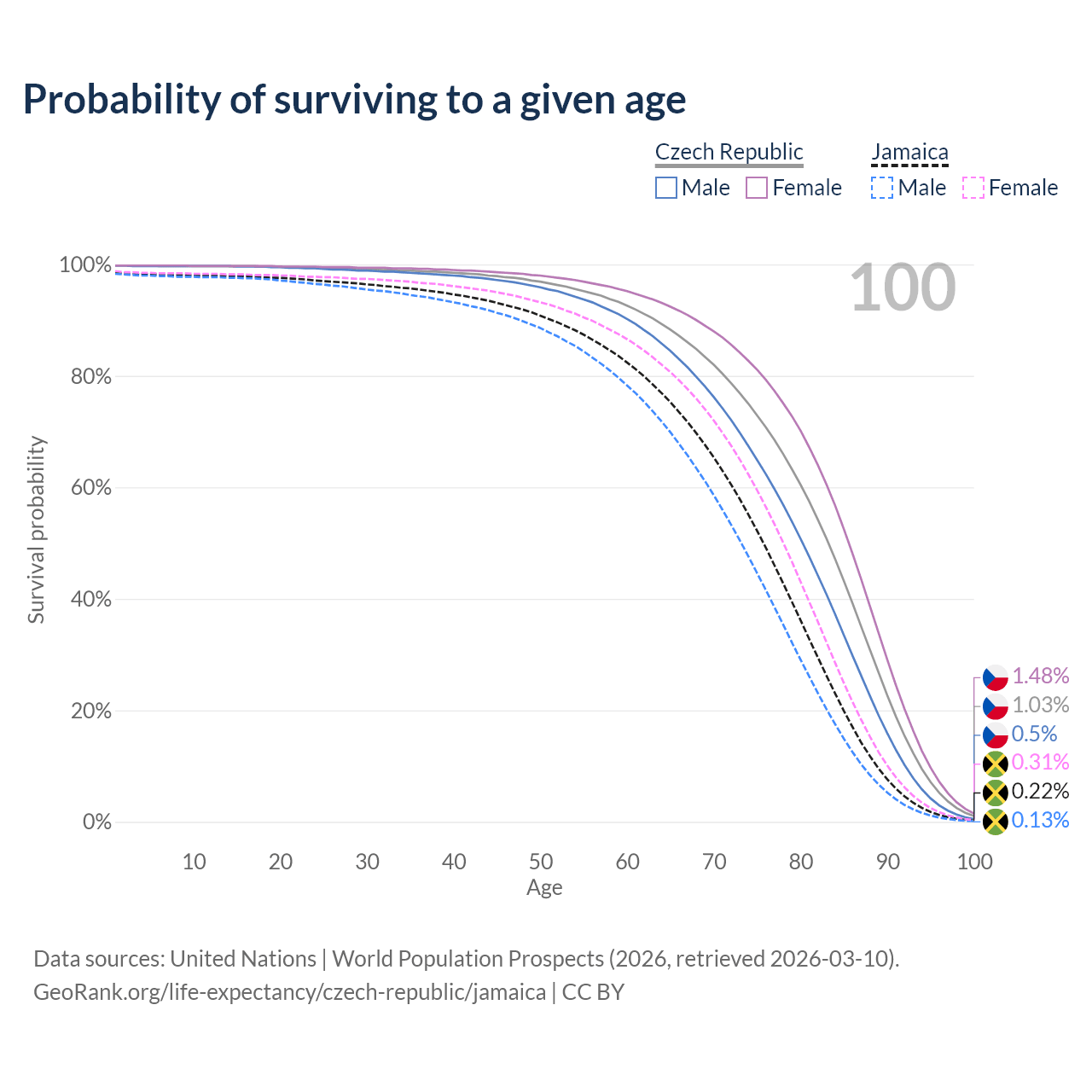 This life expectancy calculator shows the odds of living to 100, 95, 90, and below based on current age for both males and females in the Czech Republic and Jamaica, along with mean and median age of death. The calculations are based on the 2026 life tables (actuarial tables) from the UN World Population Prospects.