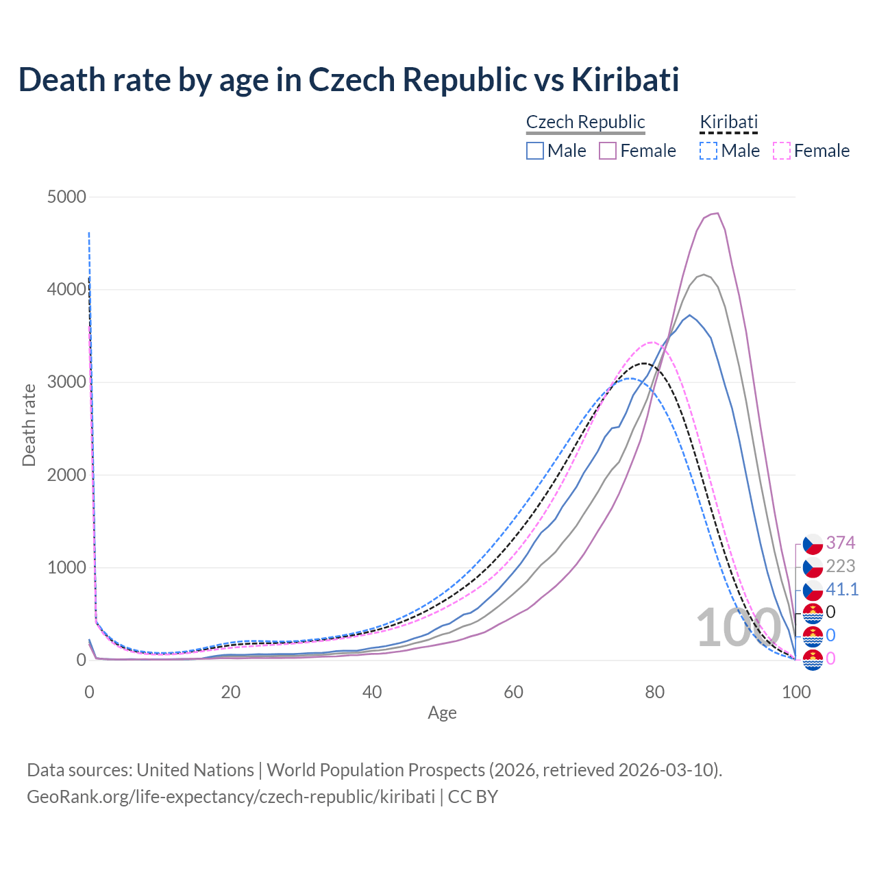 This life expectancy calculator shows the odds of living to 100, 95, 90, and below based on current age for both males and females in the Czech Republic and Kiribati, along with mean and median age of death. The calculations are based on the 2026 life tables (actuarial tables) from the UN World Population Prospects.