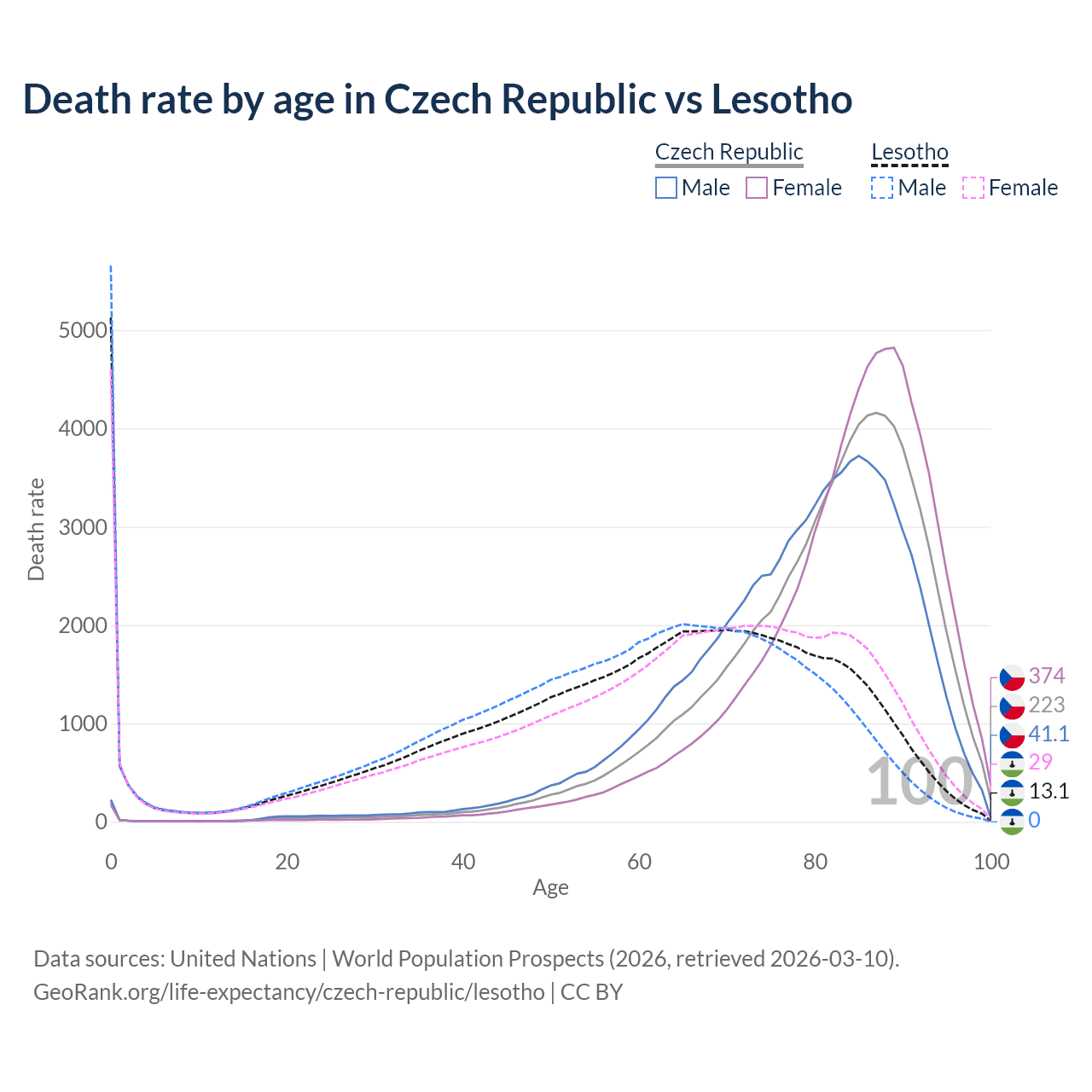 In the Czech Republic, the most common age of death is 87, compared to 0 in Lesotho. The median age of death is 83.2 in the Czech Republic and 63.4 in Lesotho, meaning only half of each cohort is expected to live past that age.