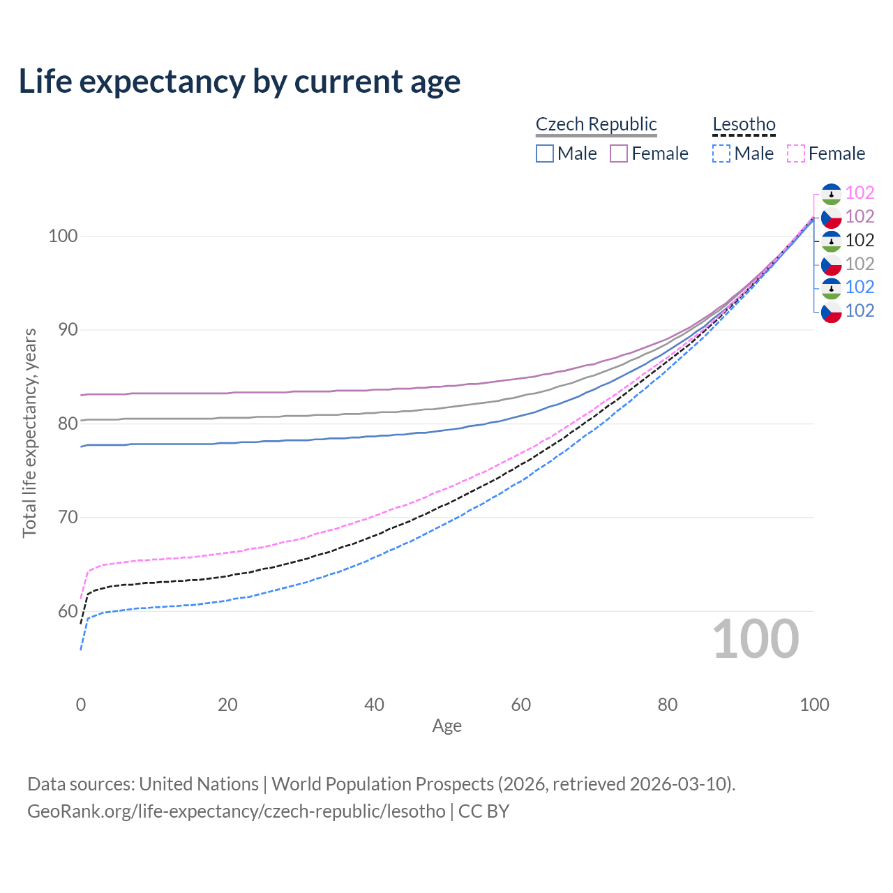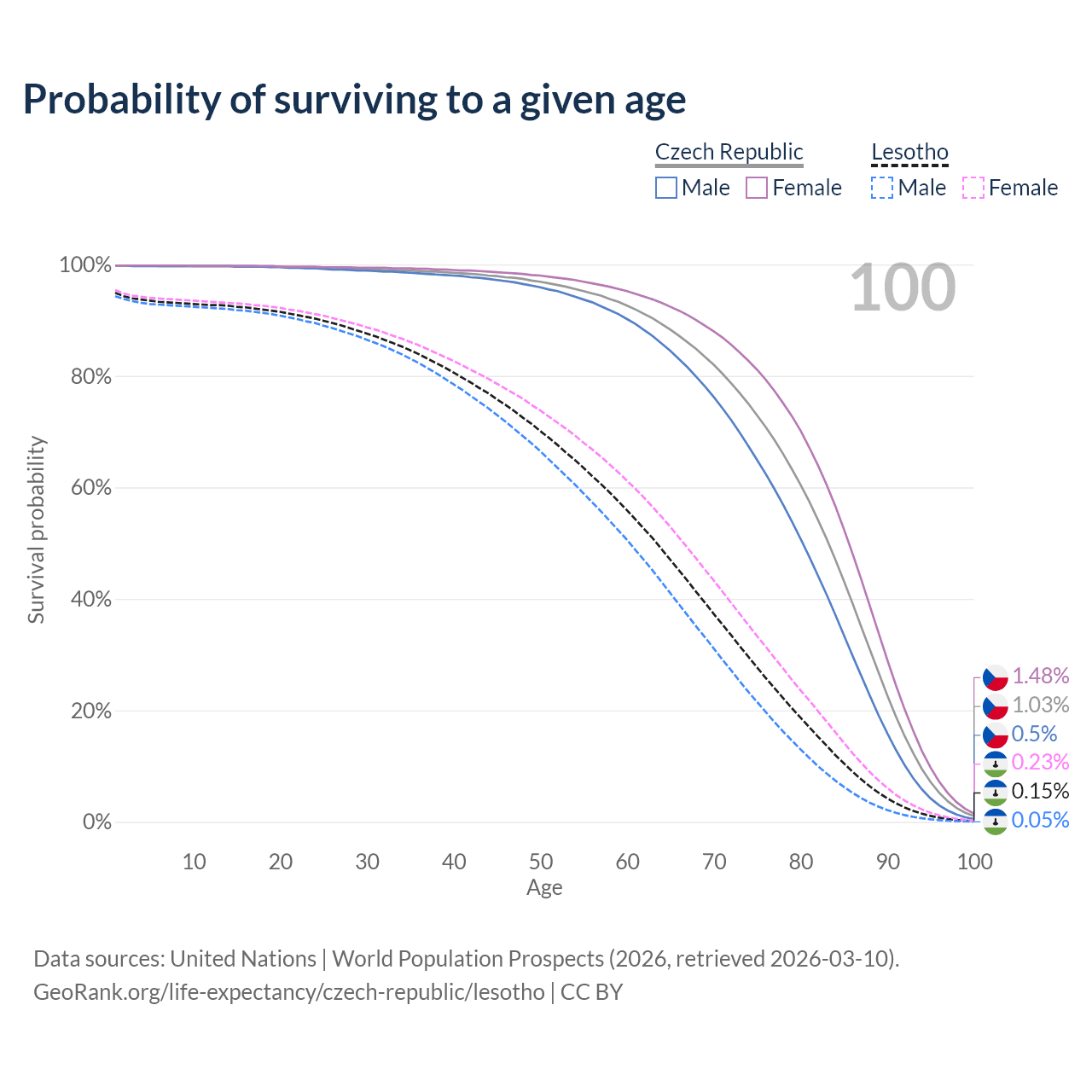This life expectancy calculator shows the odds of living to 100, 95, 90, and below based on current age for both males and females in the Czech Republic and Lesotho, along with mean and median age of death. The calculations are based on the 2026 life tables (actuarial tables) from the UN World Population Prospects.