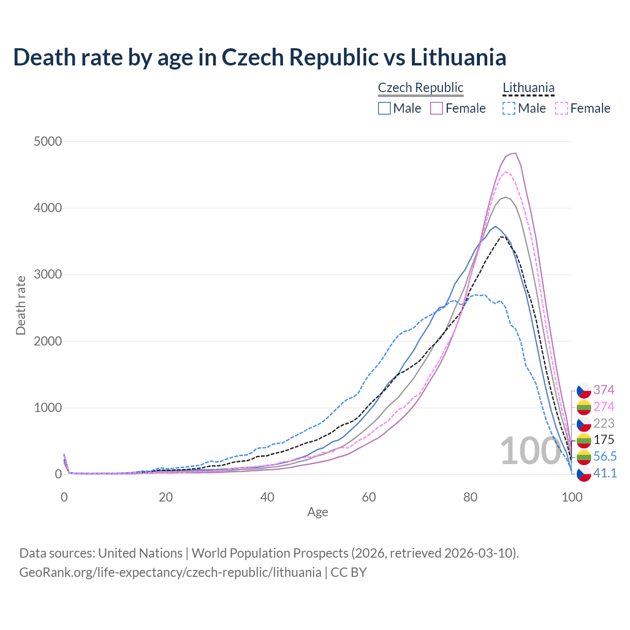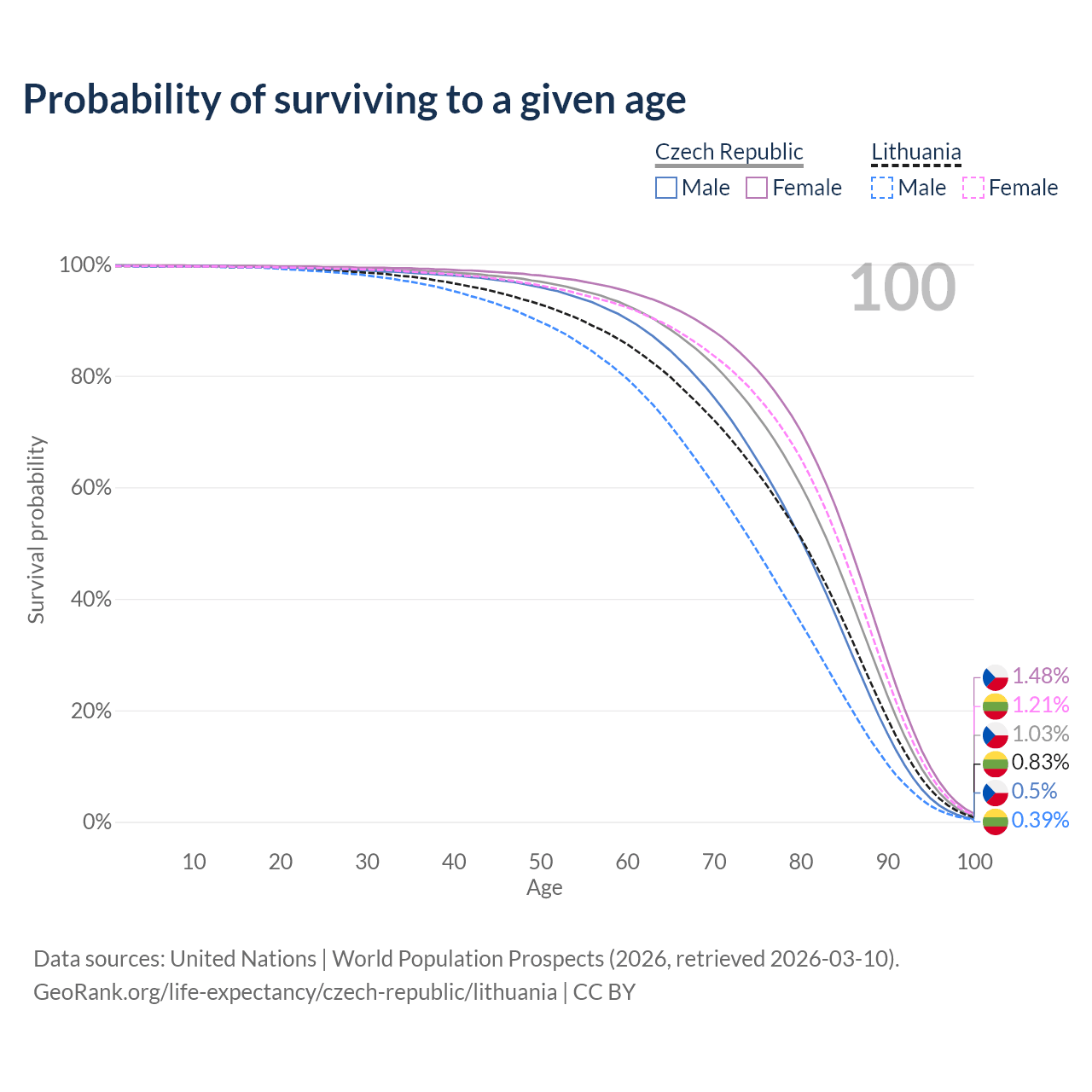 This life expectancy calculator shows the odds of living to 100, 95, 90, and below based on current age for both males and females in the Czech Republic and Lithuania, along with mean and median age of death. The calculations are based on the 2026 life tables (actuarial tables) from the UN World Population Prospects.