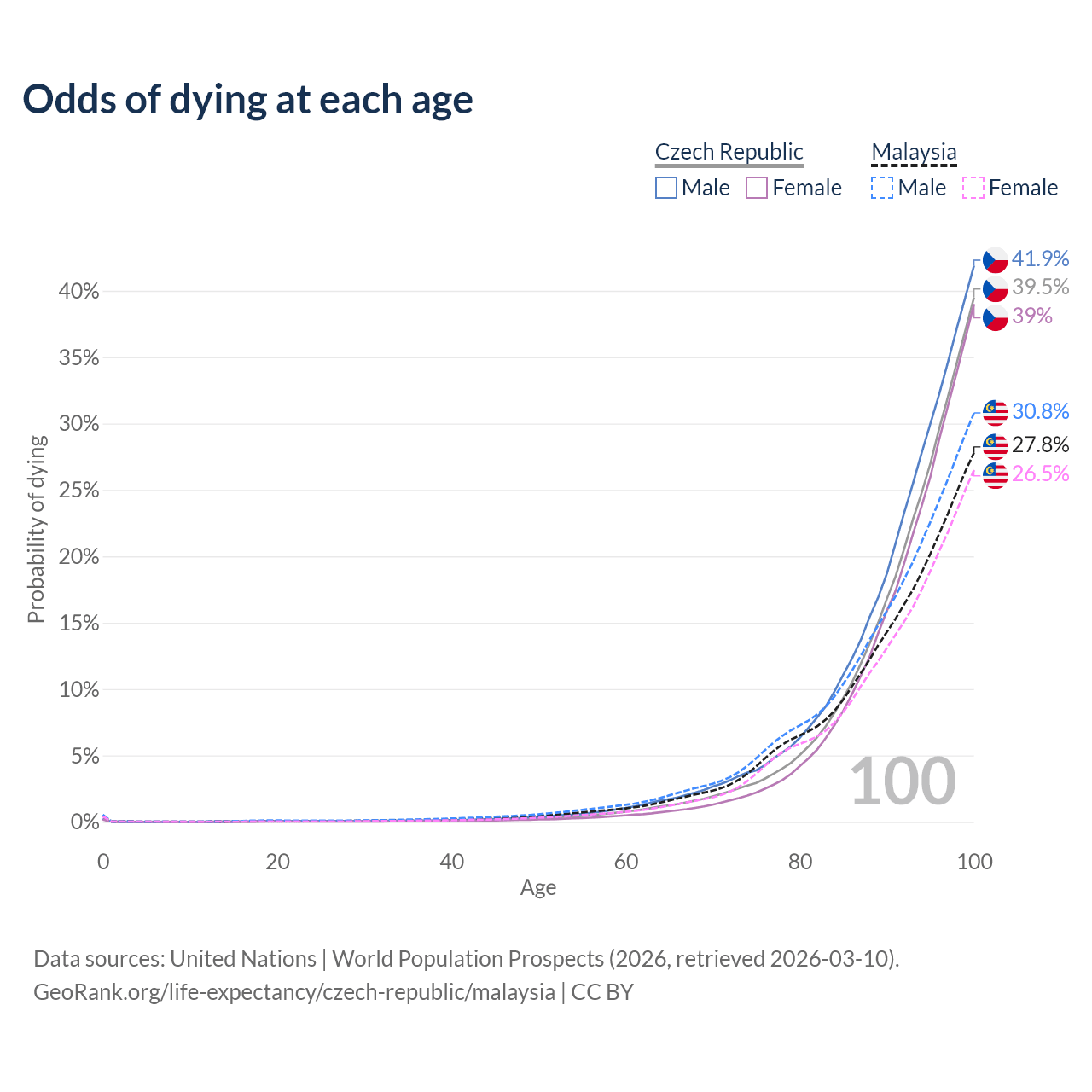 This life expectancy calculator shows the odds of living to 100, 95, 90, and below based on current age for both males and females in the Czech Republic and Malaysia, along with mean and median age of death. The calculations are based on the 2026 life tables (actuarial tables) from the UN World Population Prospects.
