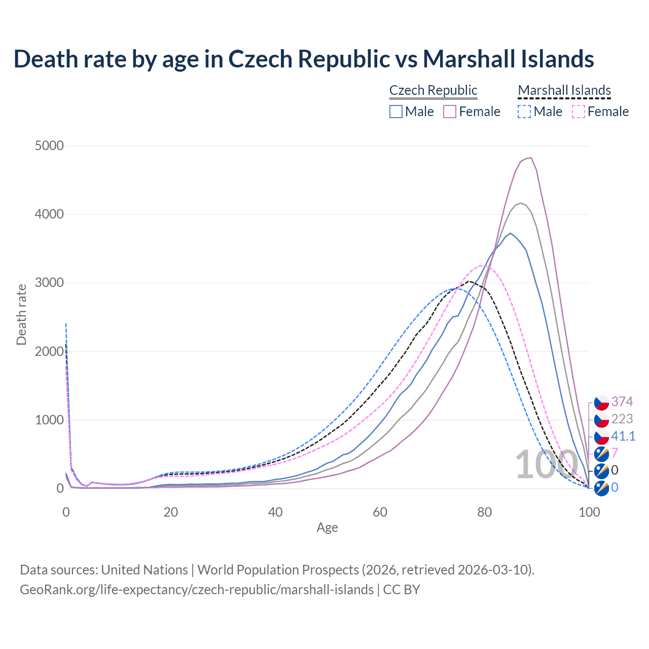 In the Czech Republic, the most common age of death is 87, compared to 77 in the Marshall Islands. The median age of death is 83.2 in the Czech Republic and 72 in the Marshall Islands, meaning only half of each cohort is expected to live past that age.