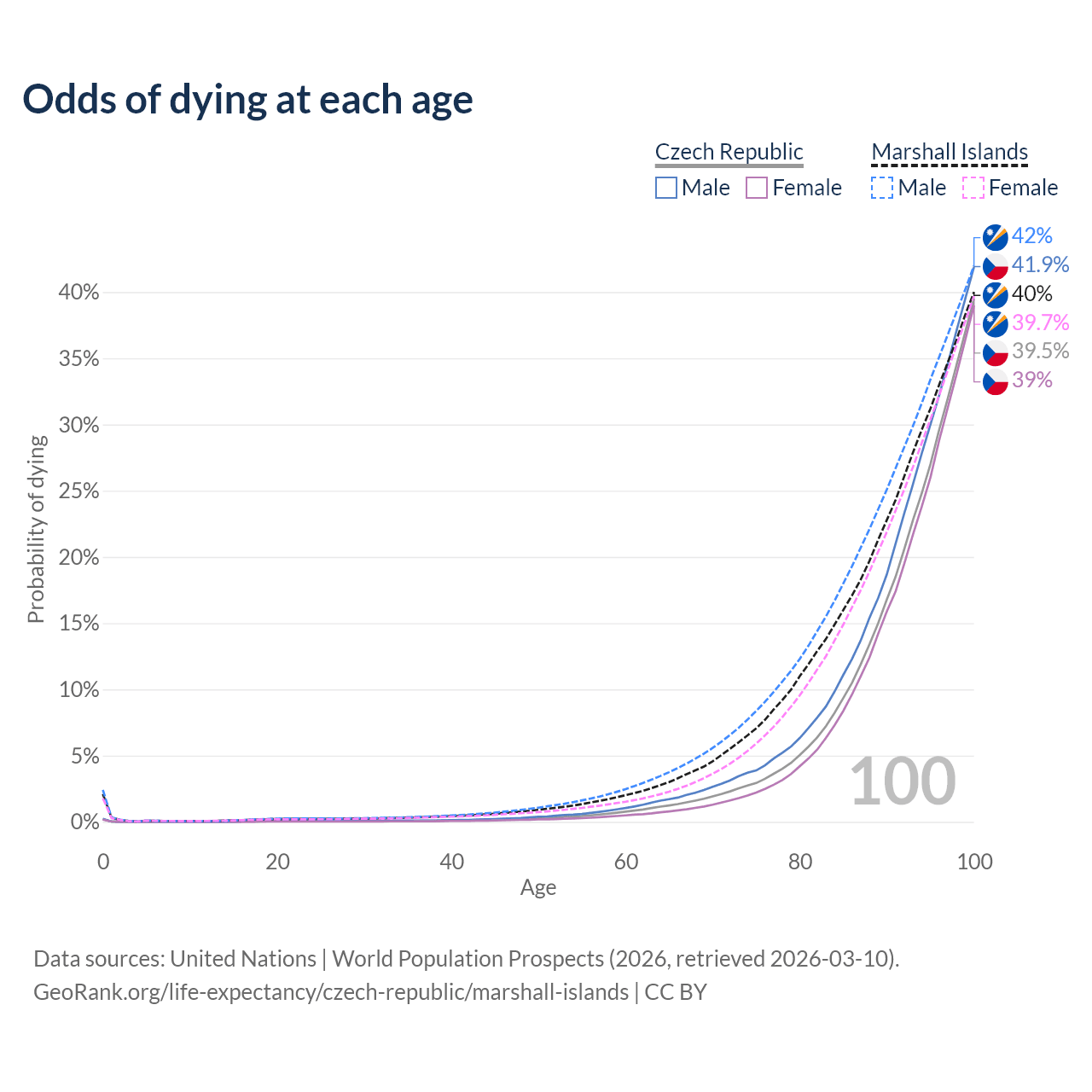 This life expectancy calculator shows the odds of living to 100, 95, 90, and below based on current age for both males and females in the Czech Republic and the Marshall Islands, along with mean and median age of death. The calculations are based on the 2026 life tables (actuarial tables) from the UN World Population Prospects.