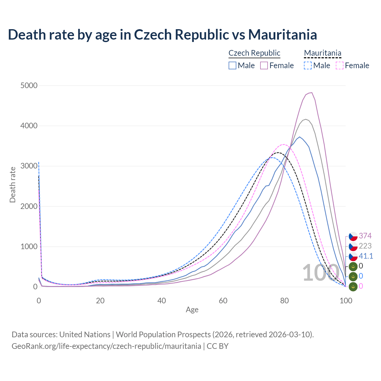 In the Czech Republic, the most common age of death is 87, compared to 78 in Mauritania. The median age of death is 83.2 in the Czech Republic and 74.1 in Mauritania, meaning only half of each cohort is expected to live past that age.
