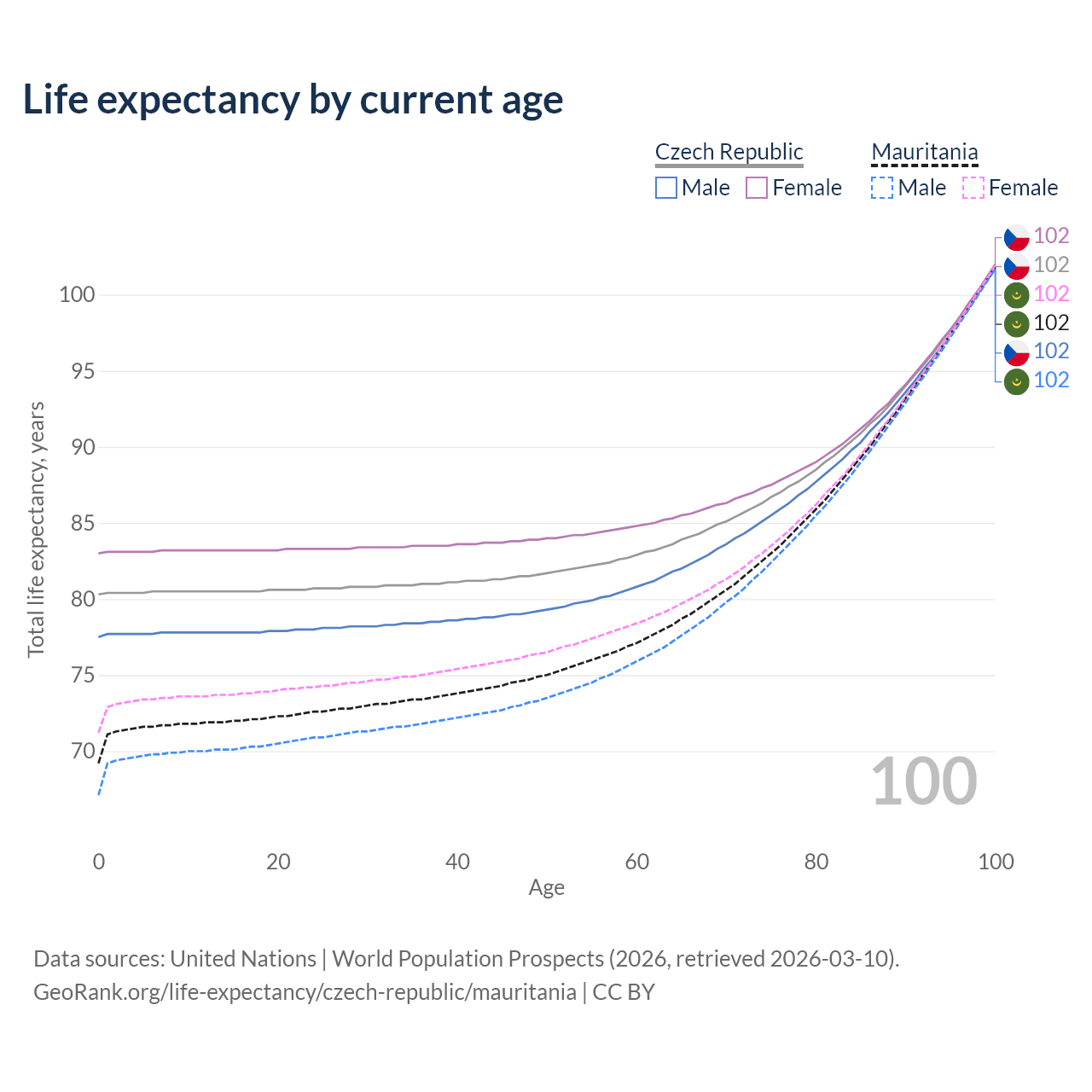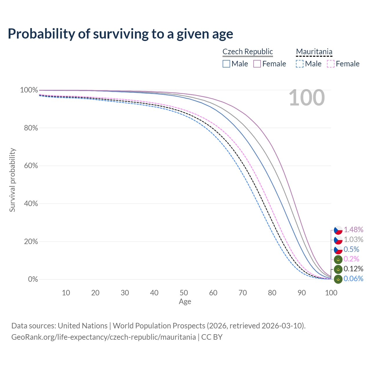 This life expectancy calculator shows the odds of living to 100, 95, 90, and below based on current age for both males and females in the Czech Republic and Mauritania, along with mean and median age of death. The calculations are based on the 2026 life tables (actuarial tables) from the UN World Population Prospects.