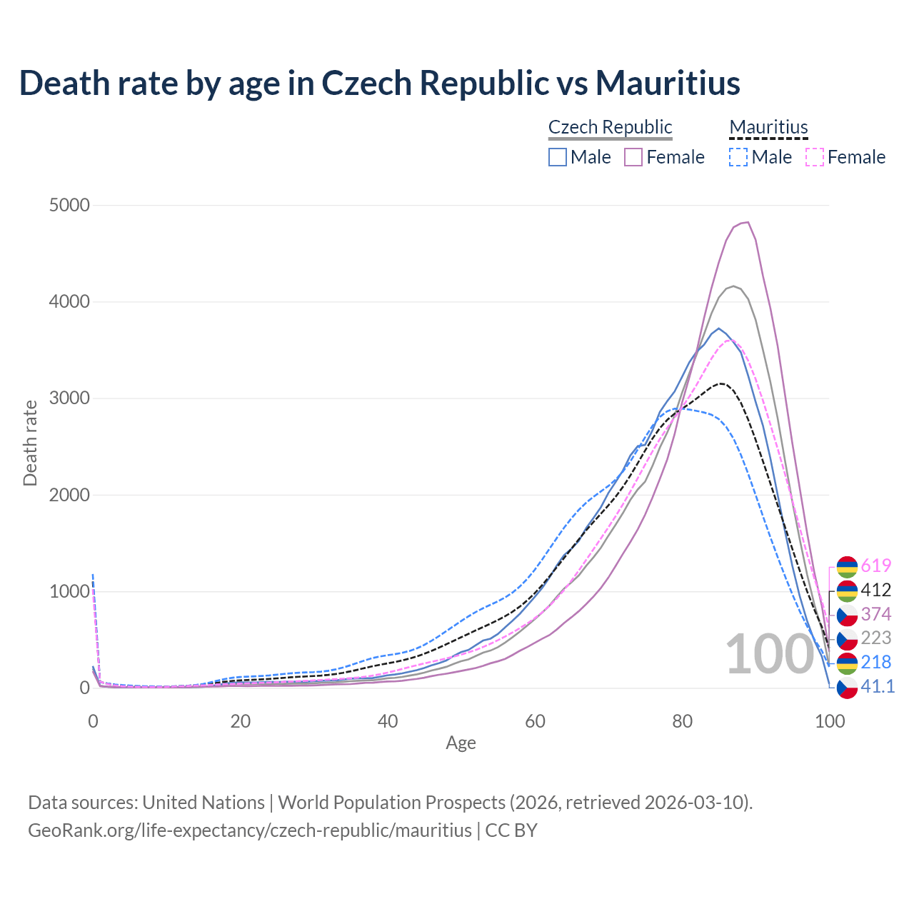 In the Czech Republic, the most common age of death is 87, compared to 85 in Mauritius. The median age of death is 83.2 in the Czech Republic and 79.1 in Mauritius, meaning only half of each cohort is expected to live past that age.