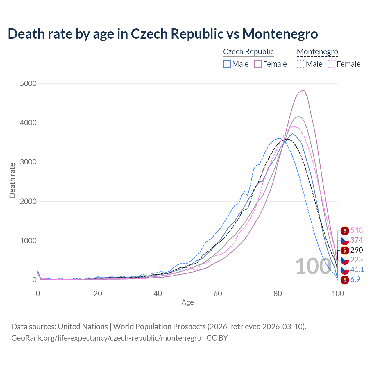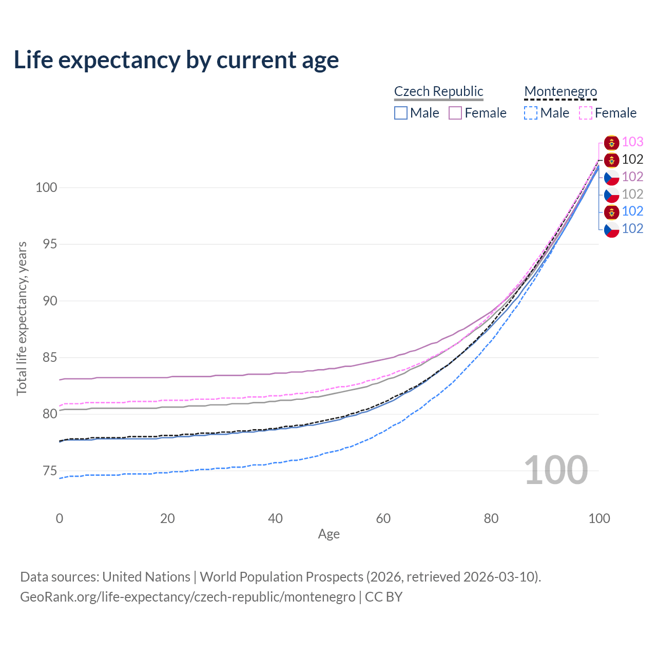 This life expectancy calculator shows the odds of living to 100, 95, 90, and below based on current age for both males and females in the Czech Republic and Montenegro, along with mean and median age of death. The calculations are based on the 2026 life tables (actuarial tables) from the UN World Population Prospects.