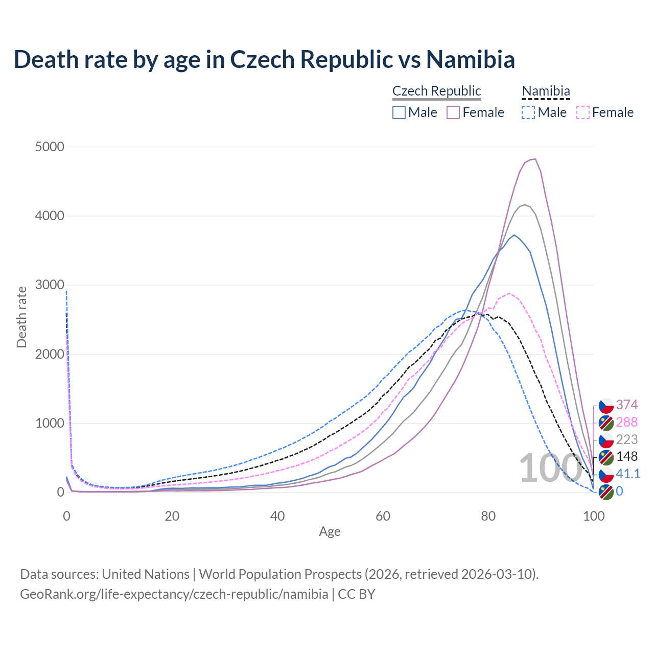 In the Czech Republic, the most common age of death is 87, compared to 0 in Namibia. The median age of death is 83.2 in the Czech Republic and 72.7 in Namibia, meaning only half of each cohort is expected to live past that age.