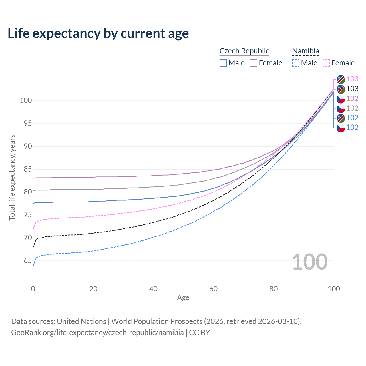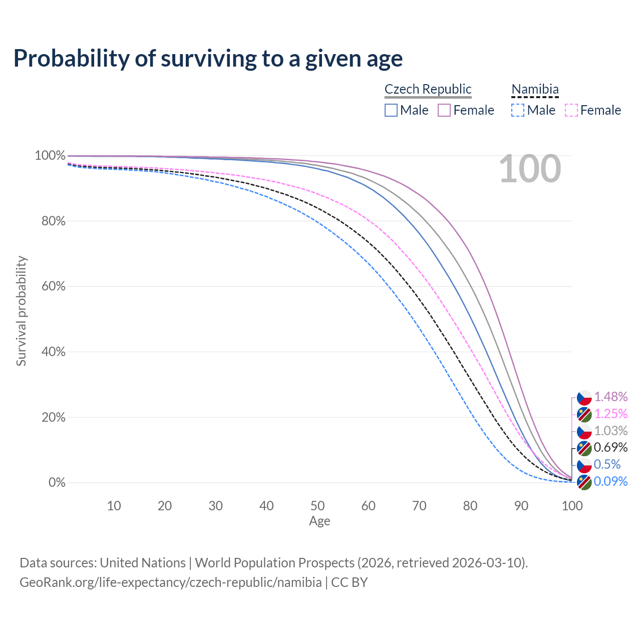 This life expectancy calculator shows the odds of living to 100, 95, 90, and below based on current age for both males and females in the Czech Republic and Namibia, along with mean and median age of death. The calculations are based on the 2026 life tables (actuarial tables) from the UN World Population Prospects.