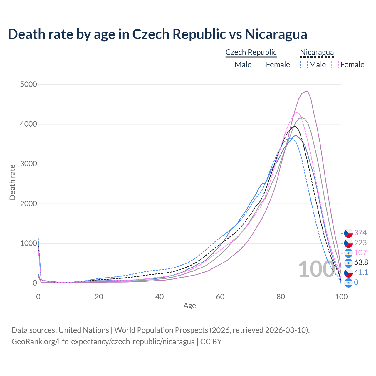 In the Czech Republic, the most common age of death is 87, compared to 85 in Nicaragua. The median age of death is 83.2 in the Czech Republic and 79.9 in Nicaragua, meaning only half of each cohort is expected to live past that age.