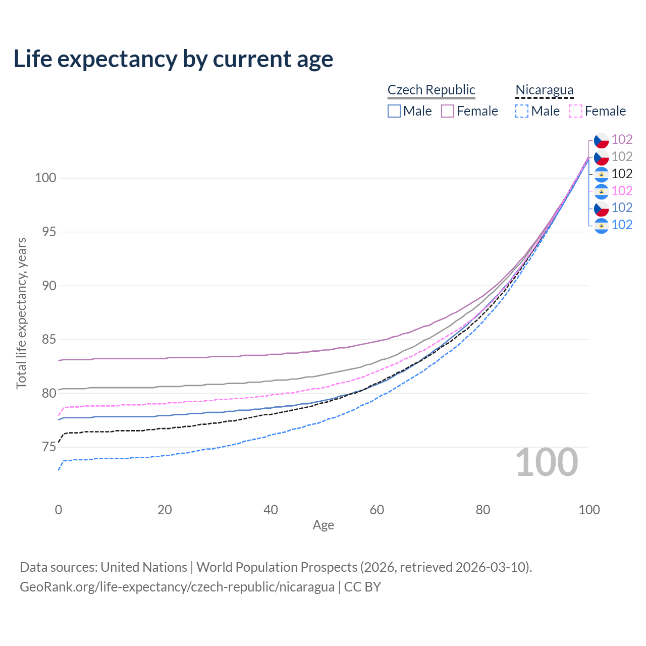 The average life expectancy at birth is 80.3 years in the Czech Republic vs 75.4 in Nicaragua. The Czech Republic is ranked 44/197 by life expectancy, and Nicaragua is 91/197. In the Czech Republic, the life expectancy is 77.5 years for males and 83 years for females. In Nicaragua, it's 72.8 years for males and 77.9 years for females.