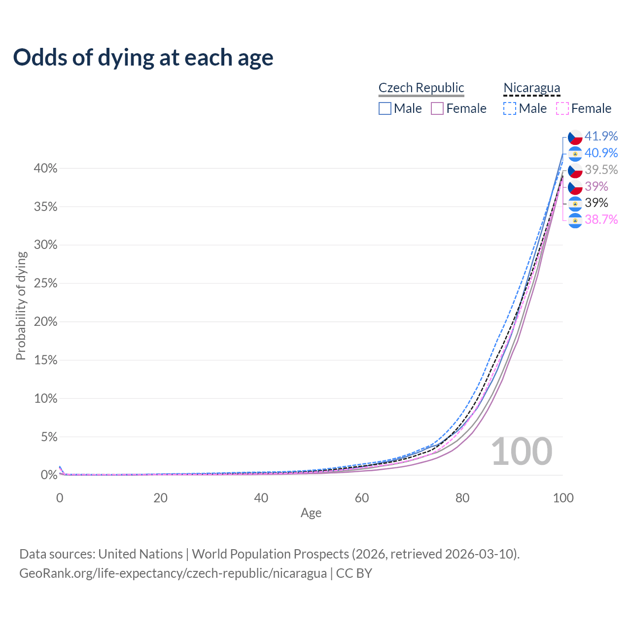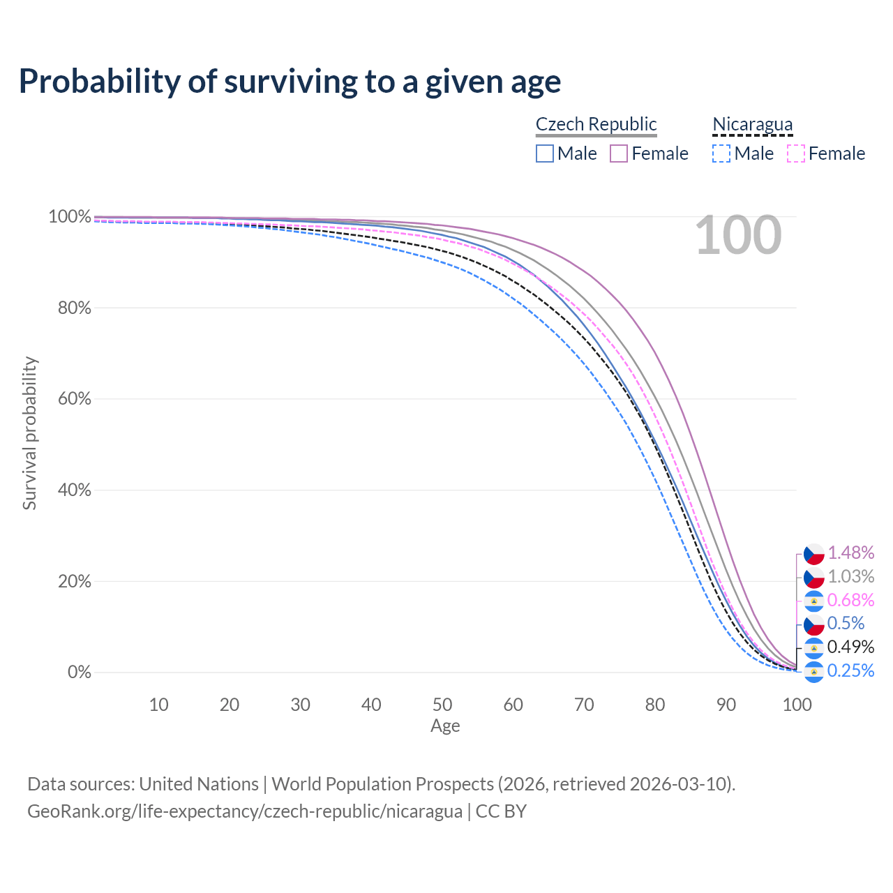 This life expectancy calculator shows the odds of living to 100, 95, 90, and below based on current age for both males and females in the Czech Republic and Nicaragua, along with mean and median age of death. The calculations are based on the 2026 life tables (actuarial tables) from the UN World Population Prospects.