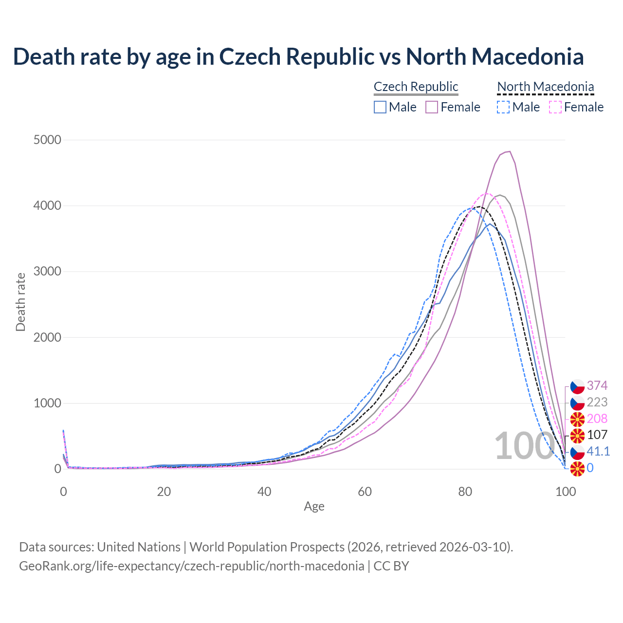 In the Czech Republic, the most common age of death is 87, compared to 83 in North Macedonia. The median age of death is 83.2 in the Czech Republic and 80.3 in North Macedonia, meaning only half of each cohort is expected to live past that age.