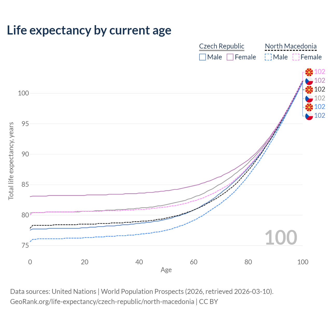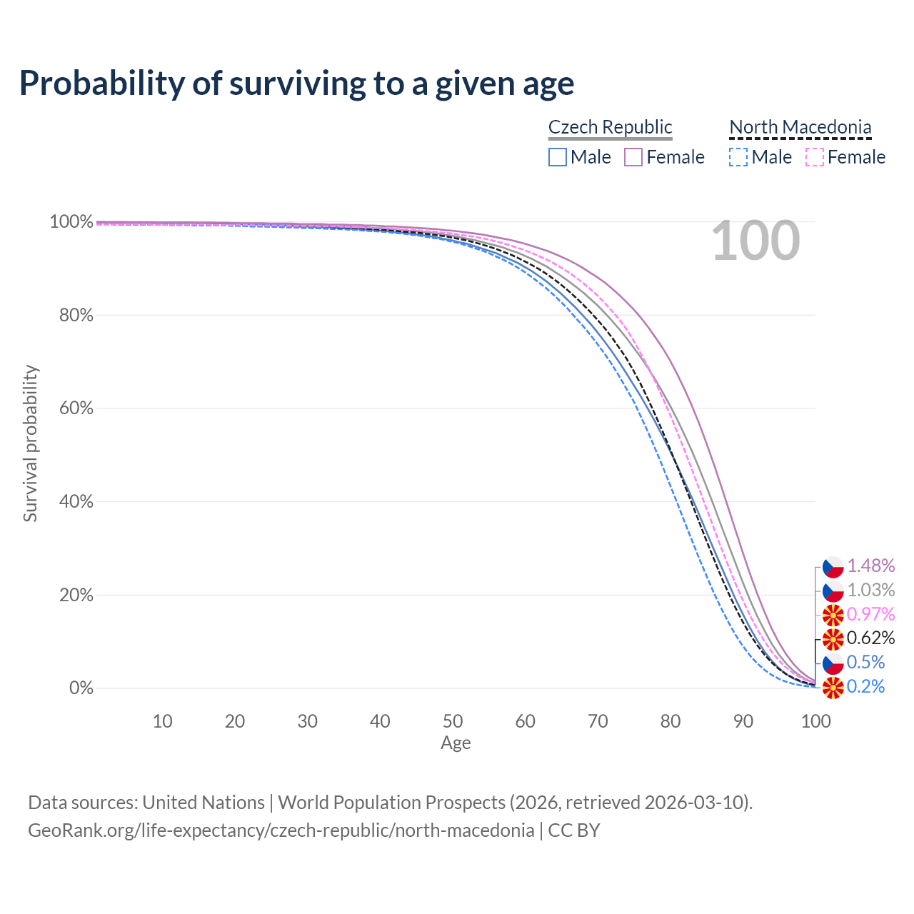 This life expectancy calculator shows the odds of living to 100, 95, 90, and below based on current age for both males and females in the Czech Republic and North Macedonia, along with mean and median age of death. The calculations are based on the 2026 life tables (actuarial tables) from the UN World Population Prospects.