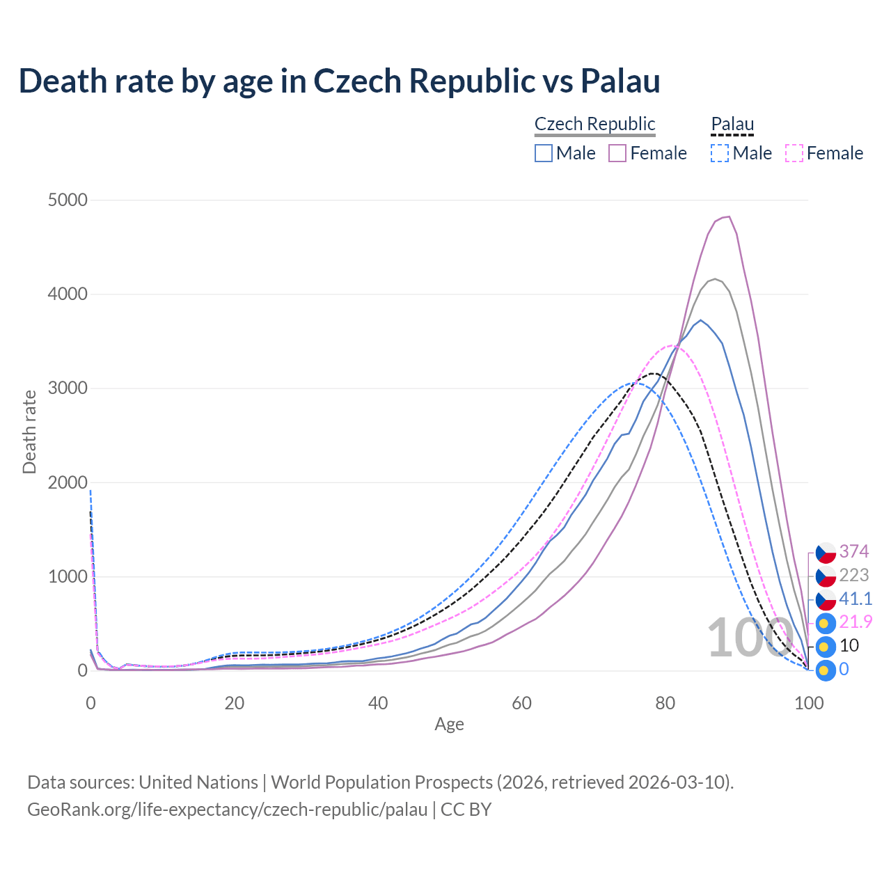 In the Czech Republic, the most common age of death is 87, compared to 78 in Palau. The median age of death is 83.2 in the Czech Republic and 73.8 in Palau, meaning only half of each cohort is expected to live past that age.